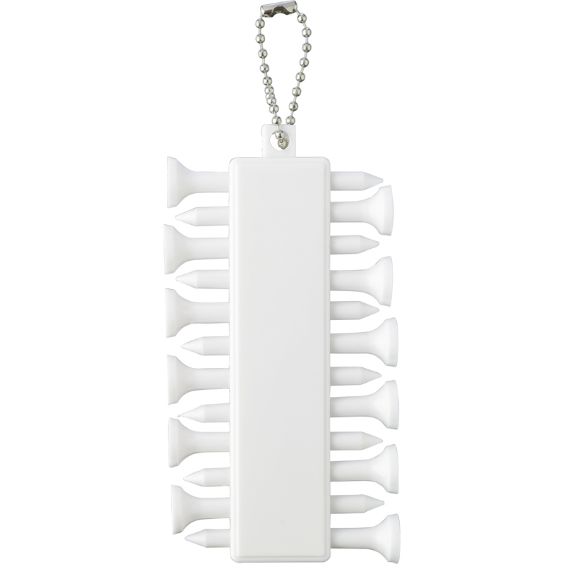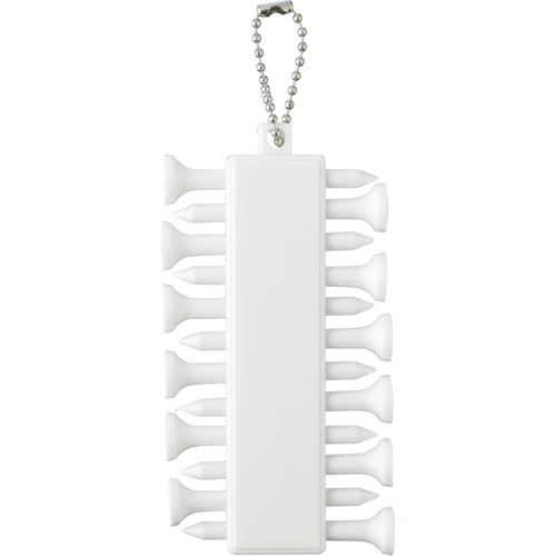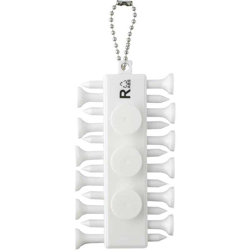 Recycled plastic golf tee set consisting of 12 tees in a compact holder with three ball markers with keychain. Includes the recycled plastic logo on the back.