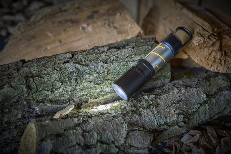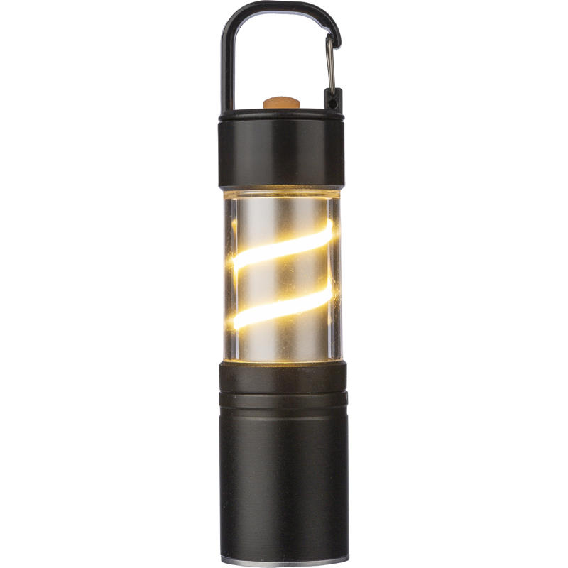 Aluminium and alloy COB flashlight with plastic casing and carabiner for carrying. Functions are zoom mode, push button, and magnetic base. Powered by 14,500–500mAh Li-ion battery with Type-C charging. Individually packaged in a brown cardboard box.