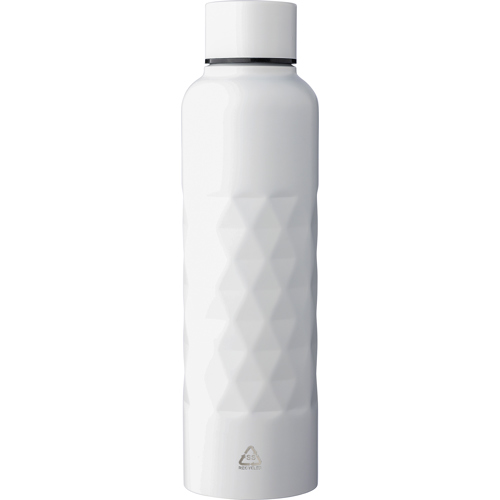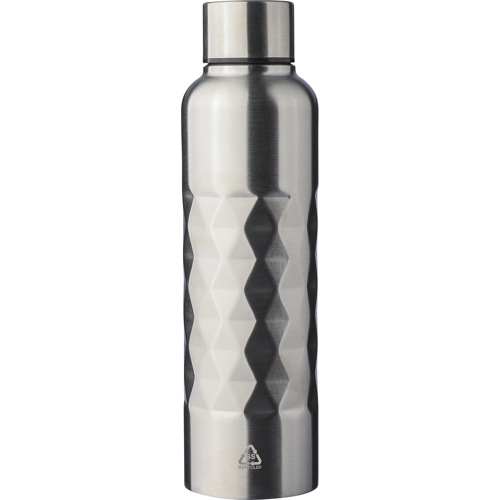 Recycled steel single-walled drinking bottle. Features a diamond-shaped texture on the body, screw top lid and a laser-engraved recycled logo. Individually packaged in a brown cardboard box.