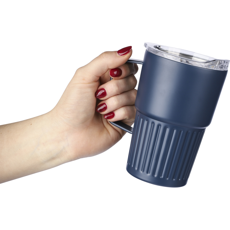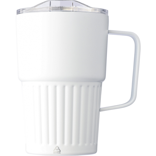 Recycled stainless steel drinking mug (450 ml) with a slide closure lid. Includes an engraved recycled logo on the body. Individually packaged in a brown cardboard box.