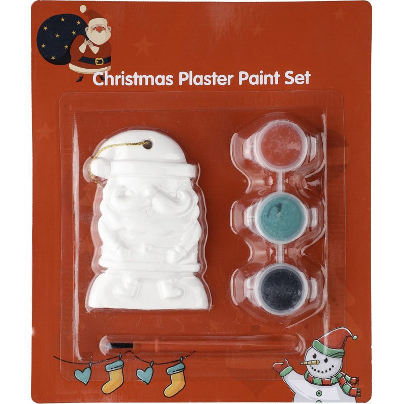 Santa painting set including one plaster figure, three acrylic paints and a brush. Features a hole with polyester cord to hang as a Christmas tree decoration.