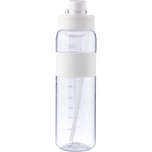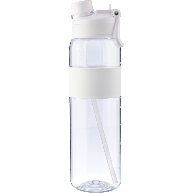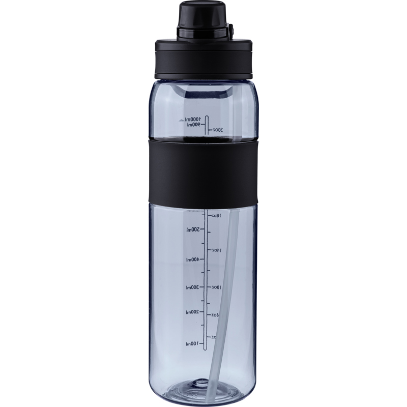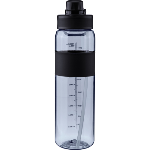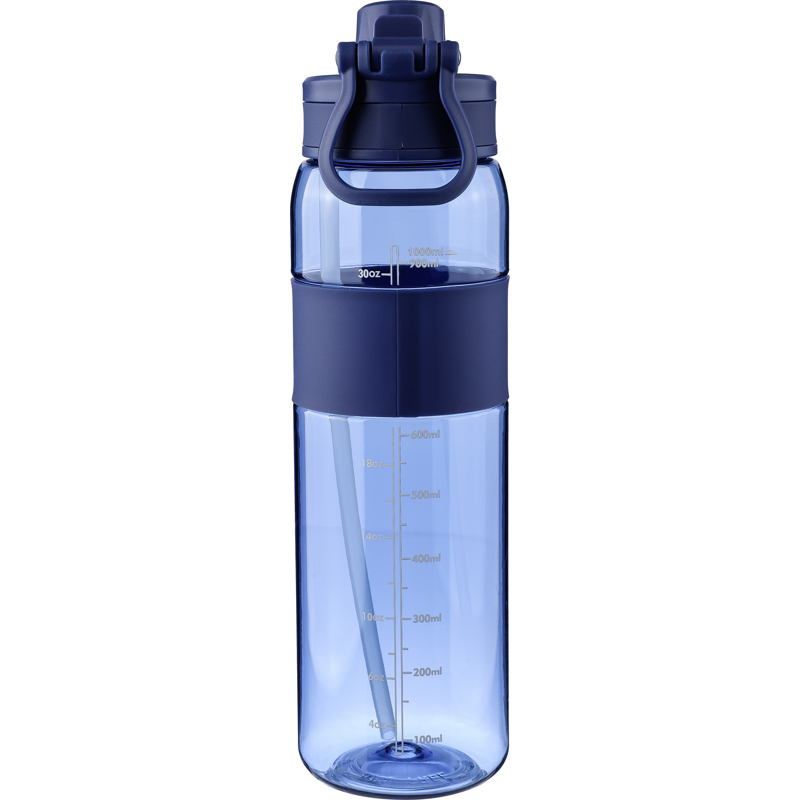 Tritan drinking bottle with two drinking options: a twist-close opening and a foldable straw with internal tube. Features a silicone grip, carrying handle and printed capacity indicator.
