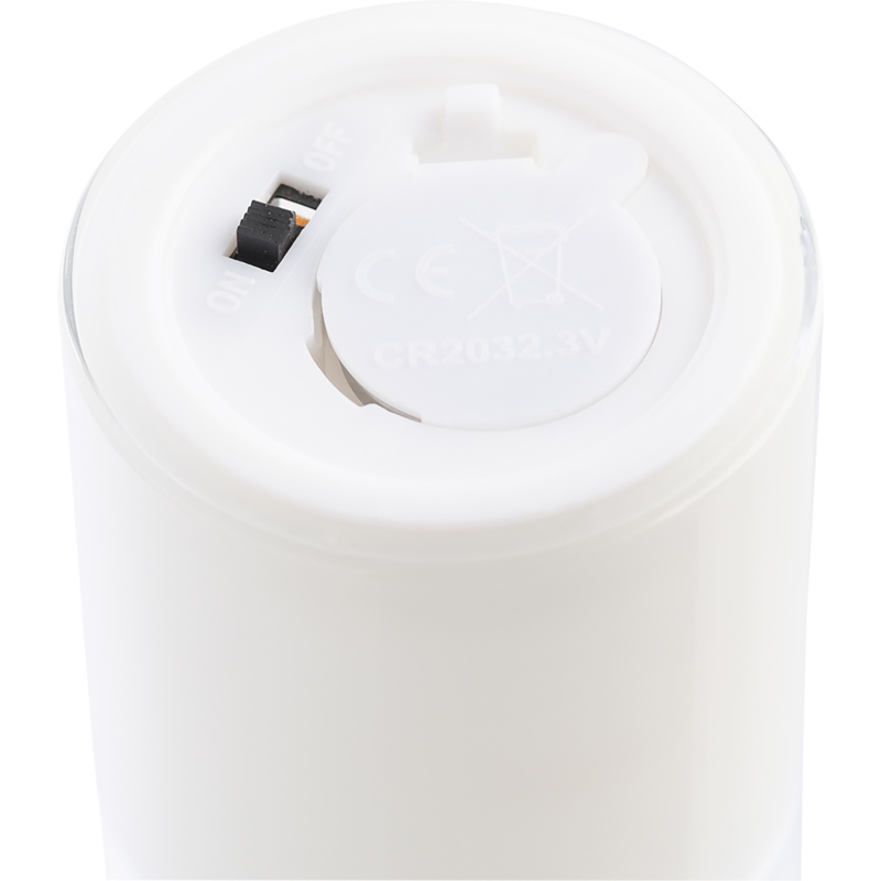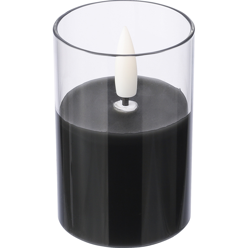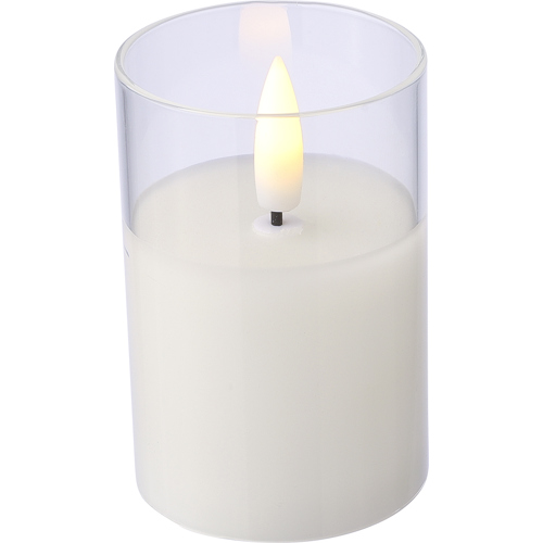 LED wax candle in glass holder with realistic flame effect. Includes battery and offers approximately 100 hours of burn time. Designed for indoor use. Individually packaged in a brown cardboard box.