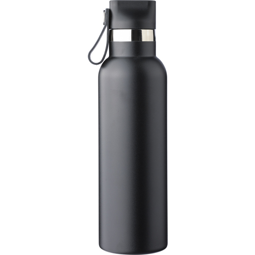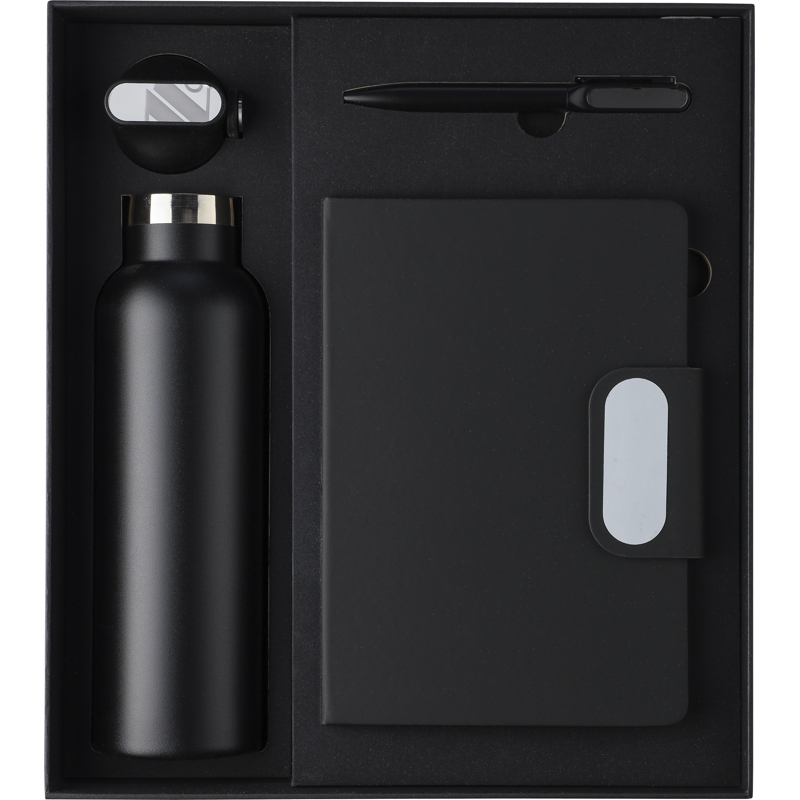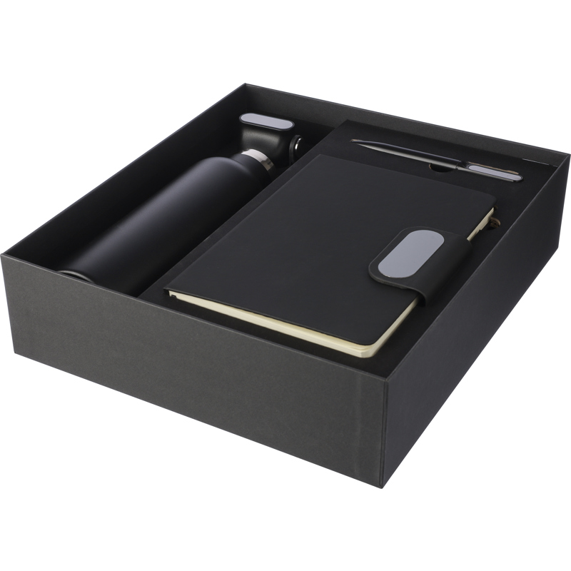 Office gift set with double walled recycled stainless steel drinking bottle a with silicone handle, recycled aluminium twist action ballpen and recycled PU notebook with 80 sheets of 70gsm lined paper, ribbon marker with a metal magnetic closure. All items feature a recycled logo.