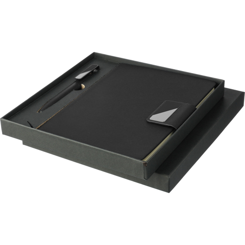 Office gift set with a recycled aluminium twist action ballpen and recycled PU notebook with 80 sheets of 70gsm lined paper, ribbon marker with a metal magnetic closure. All items feature a recycled logo.