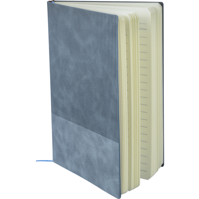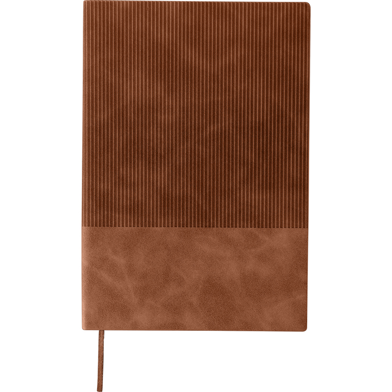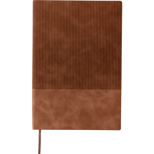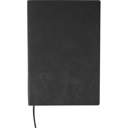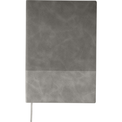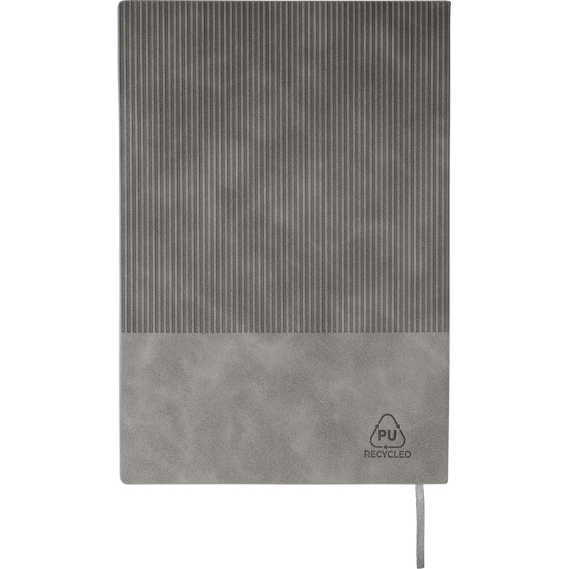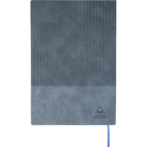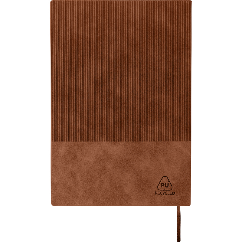 Recycled PU notebook corduroy-look finish on the top part of the front and back. Includes a ribbon bookmark and 100 lined pages of 80gsm paper. Features an embossed recycled logo on the back.
