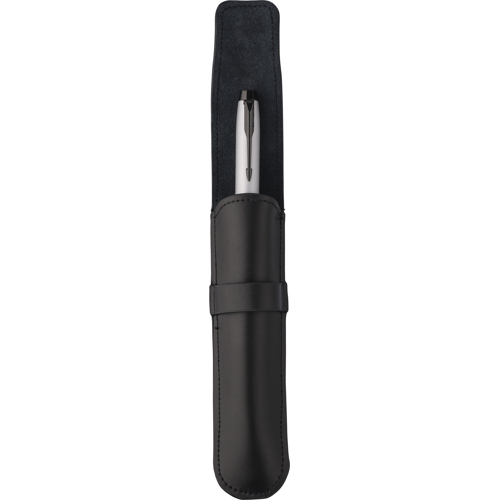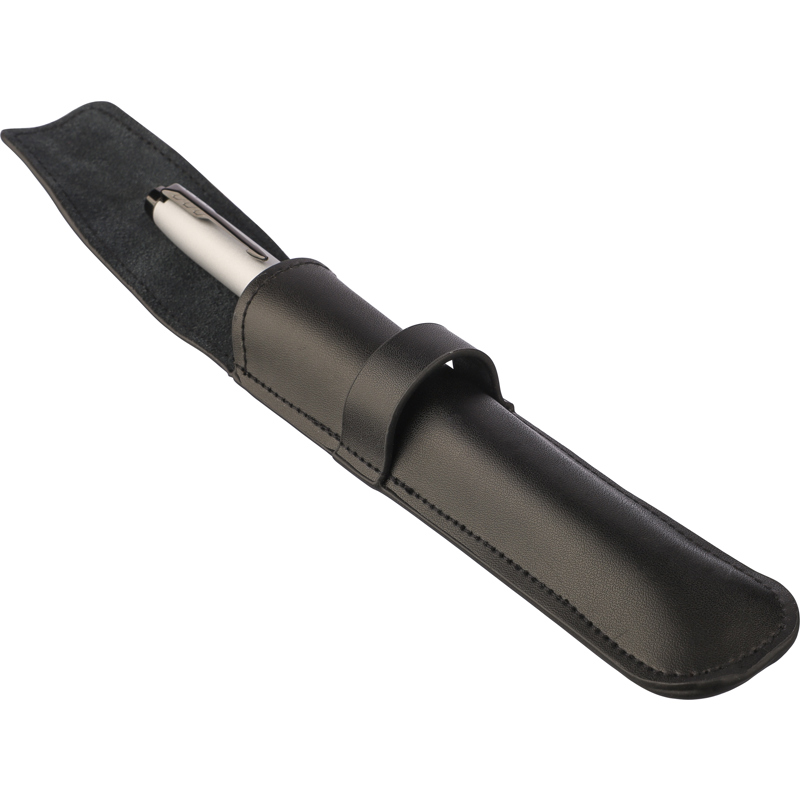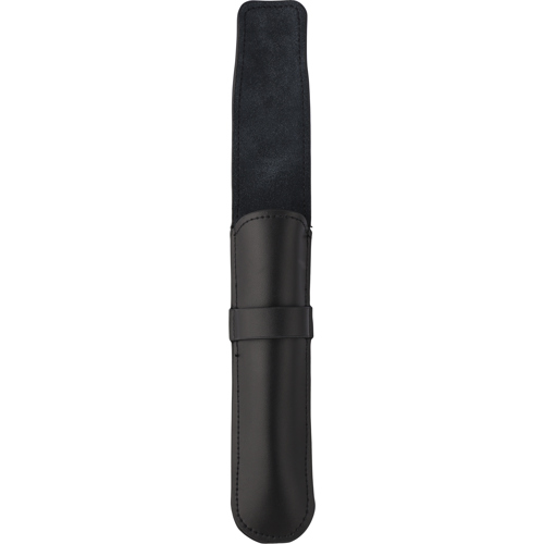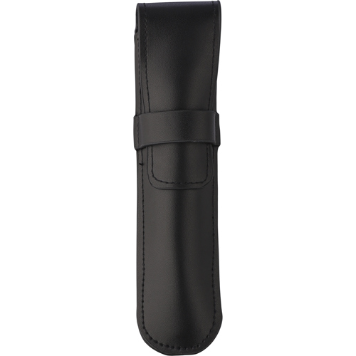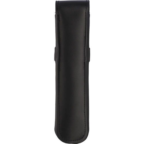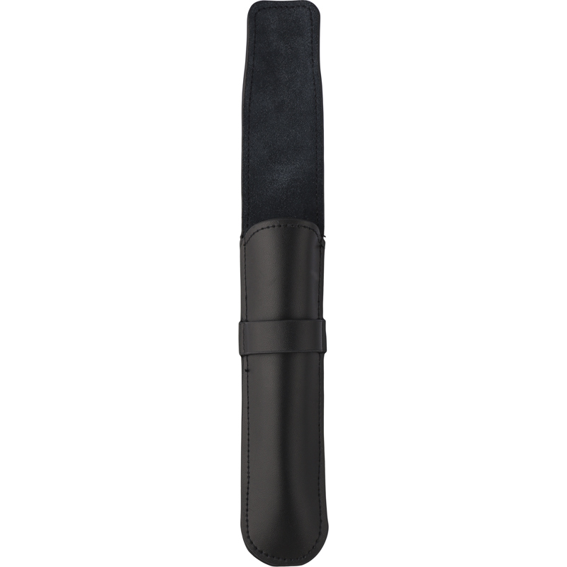 Leather pen pouch with flap and belt-style closing and a soft velvet interior. Individually packaged in a black carton sleeve. (pen not included)