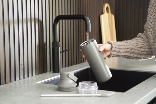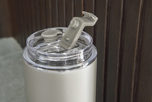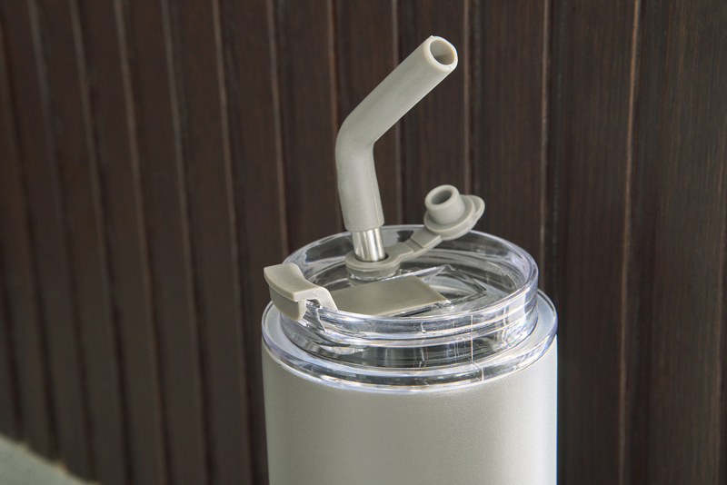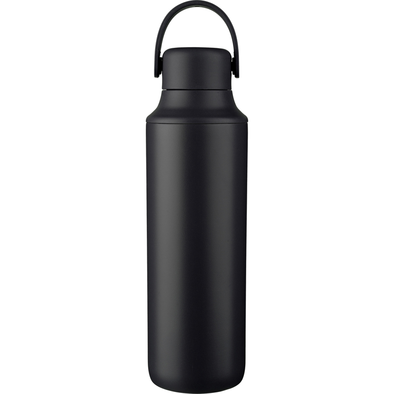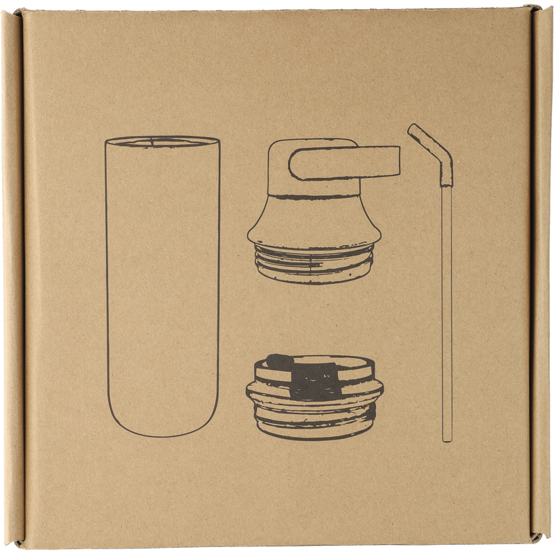Stainless steel double walled drinking bottle with a lid with carrying handle and a transparent lid with stainless steel straw with silicone tip and holder. Individually packaged in a brown cardboard box.