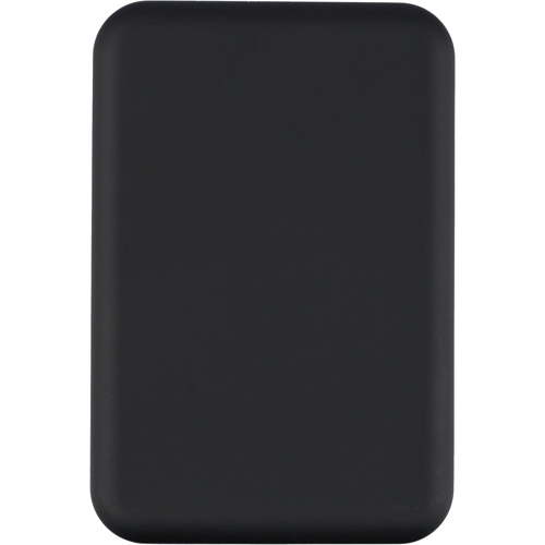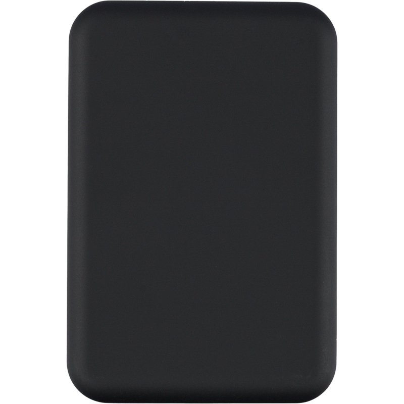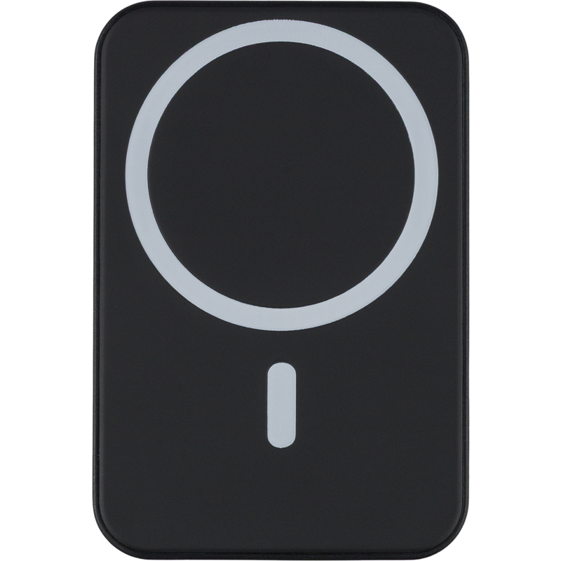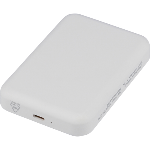 Recycled wireless charger powerbank with a 5,000 mAh capacity. 15W MagSafe-compatible wireless charging. Type-C in/out, safety protections, auto shut-off. Includes metal ring for non-MagSafe. Recycled logo on side. Packed in brown box
