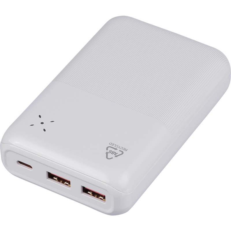 Recycled powerbank with a 20,000 mAh capacity. 22.5W fast charging. Type-C in/out, Type-A input. LED indicator, safety protections. Recycled logo on back. Packed in brown box
