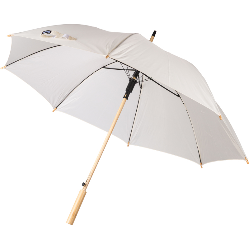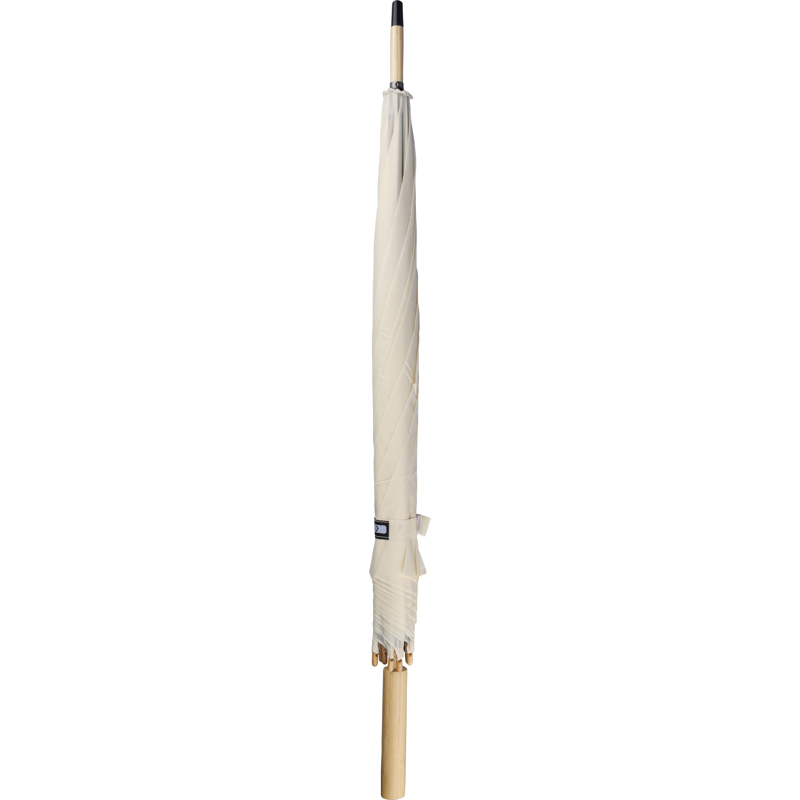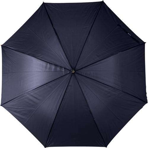 RPET automatic golf umbrella with eight panels with a bamboo handle and bamboo and steel shaft with metal frame. Includes velcro closing strap and rPET label.
