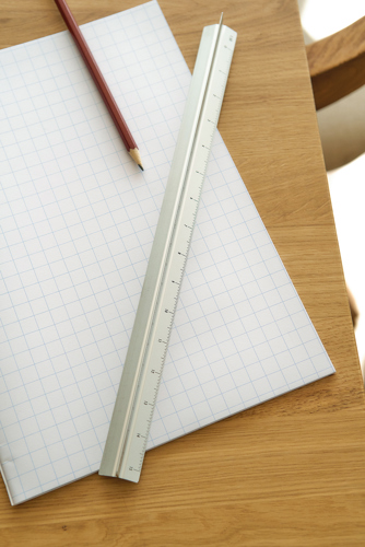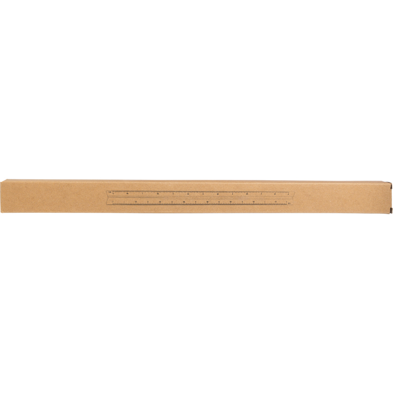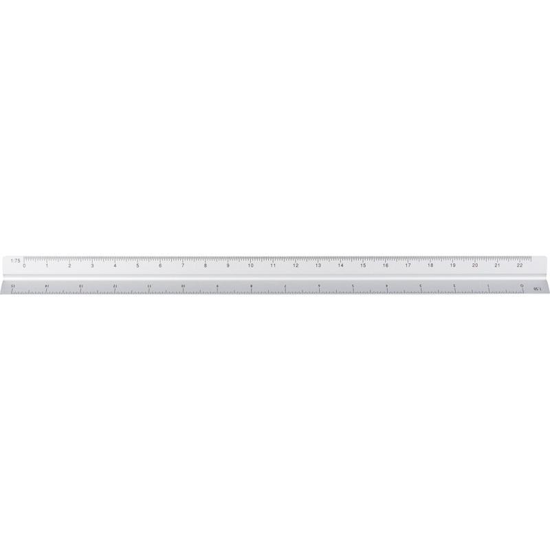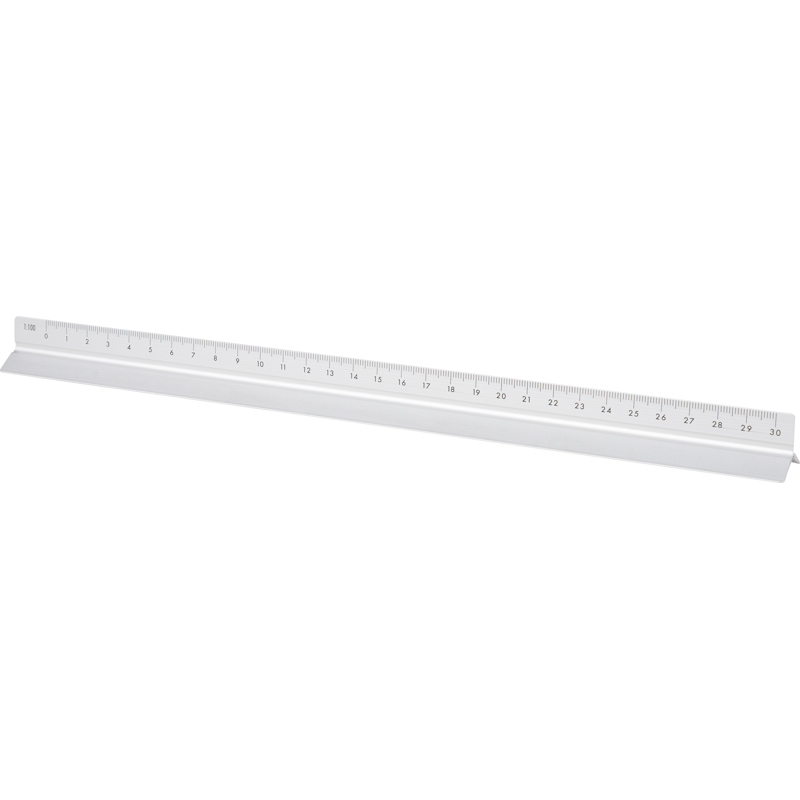 Aluminium 30cm triangular shaped ruler with measuring scales: 1:20, 1:25, 1:50, 1:75, and 1:100. and cm and inches. One side without scale for personalization. Individually packaged in a brown box.