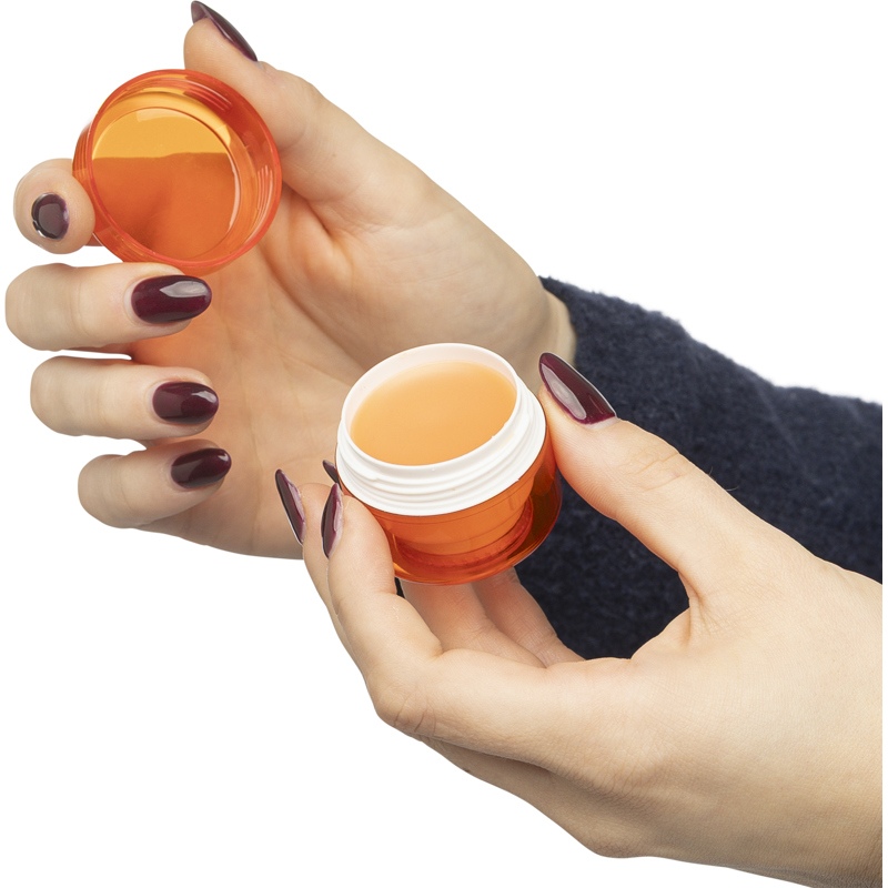 Transparent jar with 12g lip balm with SPF15 protection. The lip balm matches the colour and is available in four flavours: vanilla (21), strawberry (08), orange (07) and blueberry (24).