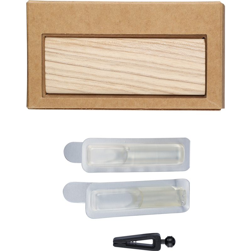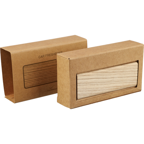 Natural beechwood car air freshener with 2 ? 3g alcohol-free sandalwood scent (one pre-filled, one refill). Clips to most standard air vents. Packed in brown cardboard box with illustration.