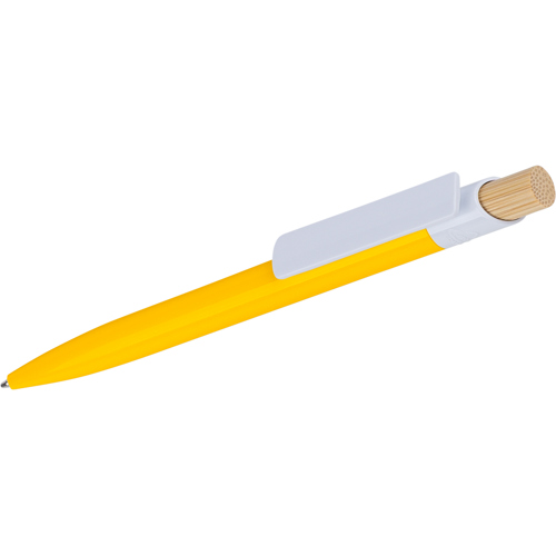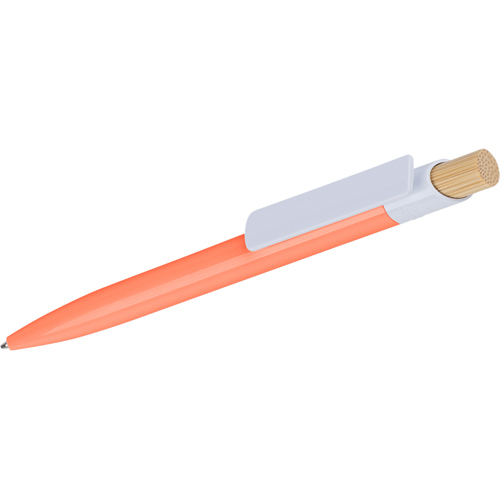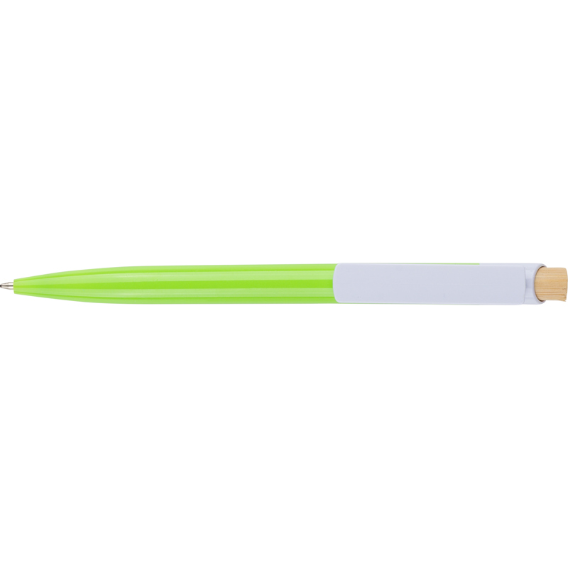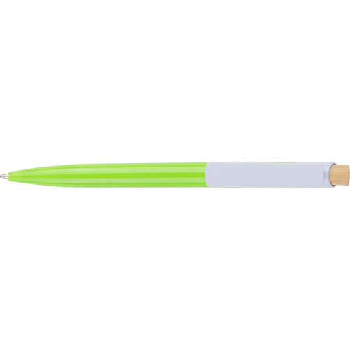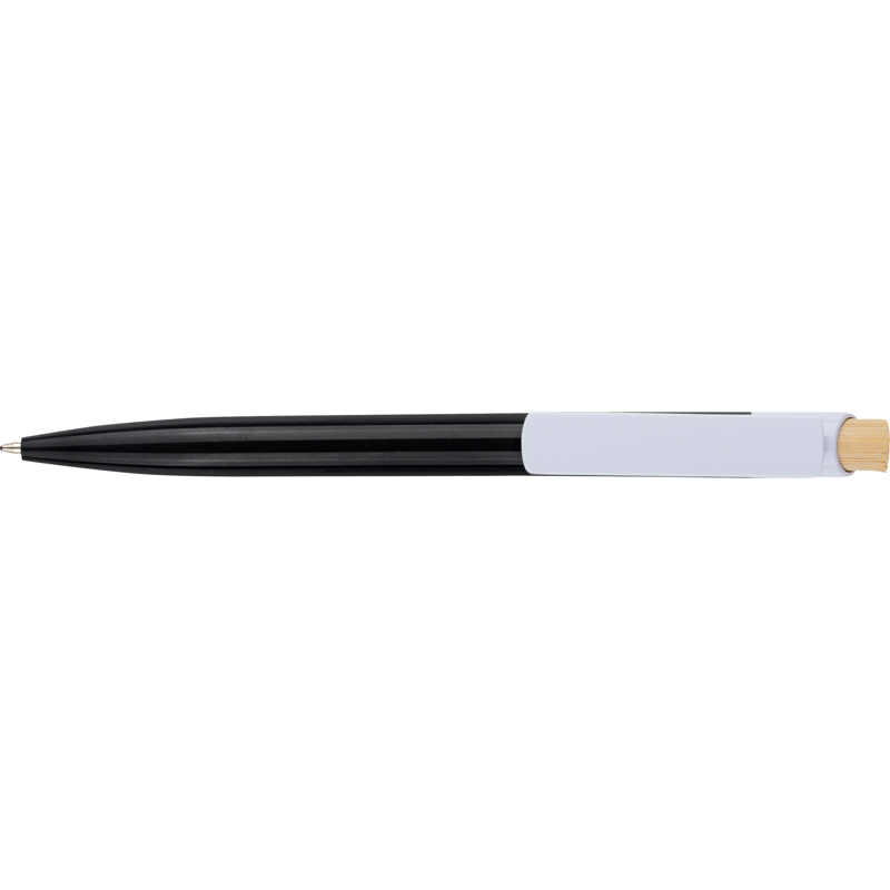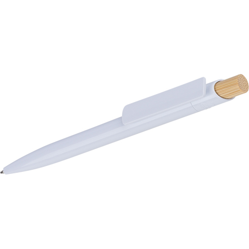 Recycled ballpen with bamboo push button and blue ink, suitable for digital printing. Features a recycled logo in the mould.