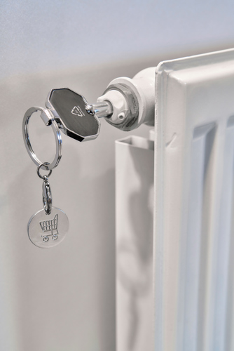 Recycled zinc alloy keychain for bleeding radiators, with a shopping trolley coin (euro).