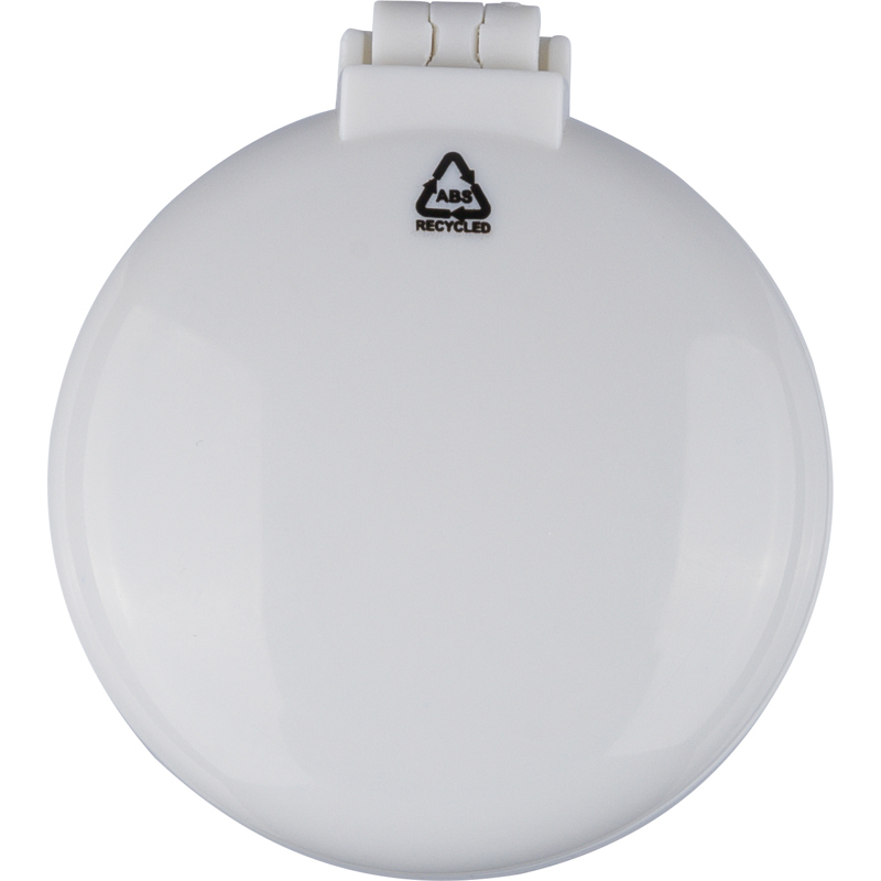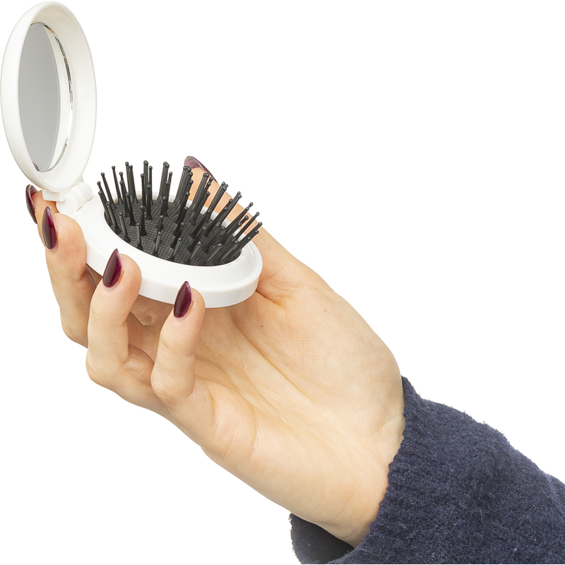 Recycled case with integrated brush and mirror. Practical design for on-the-go use and finished with a recycled logo.
