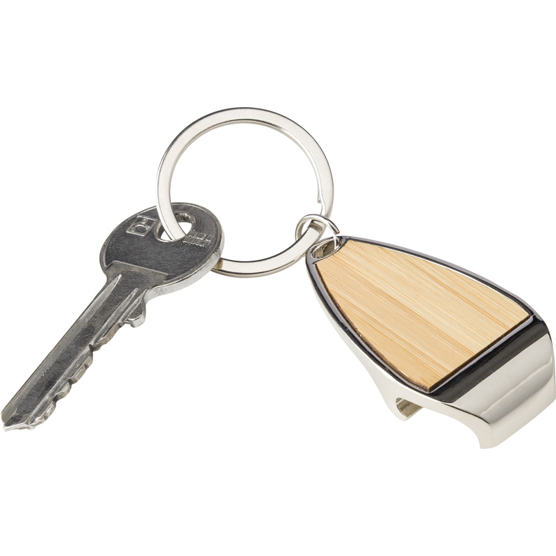 Zinc alloy keychain with a bamboo inlay on the front and bottle opener function.