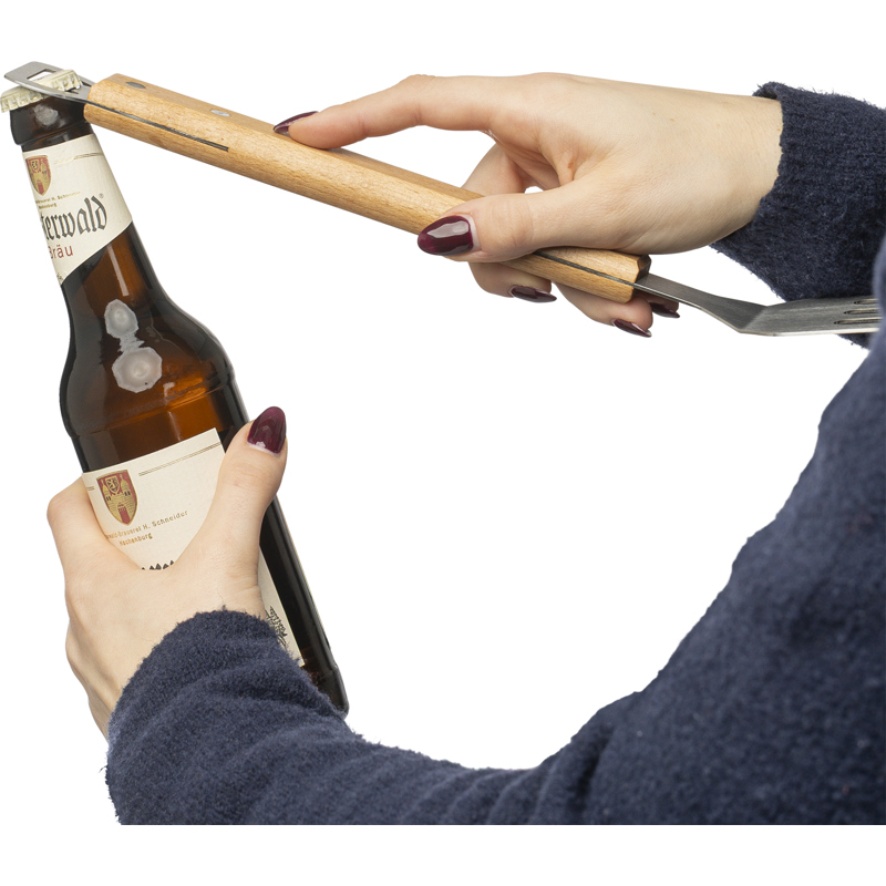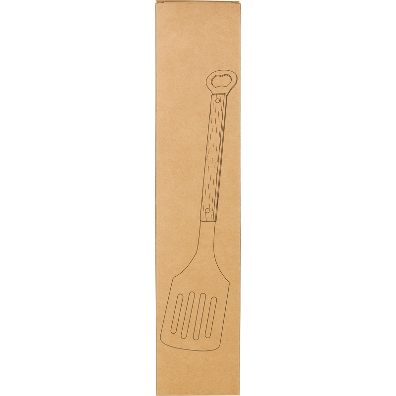 Stainless steel barbecue spatula with beechwood handle and integrated bottle opener on the end. Individually packaged in a brown box.