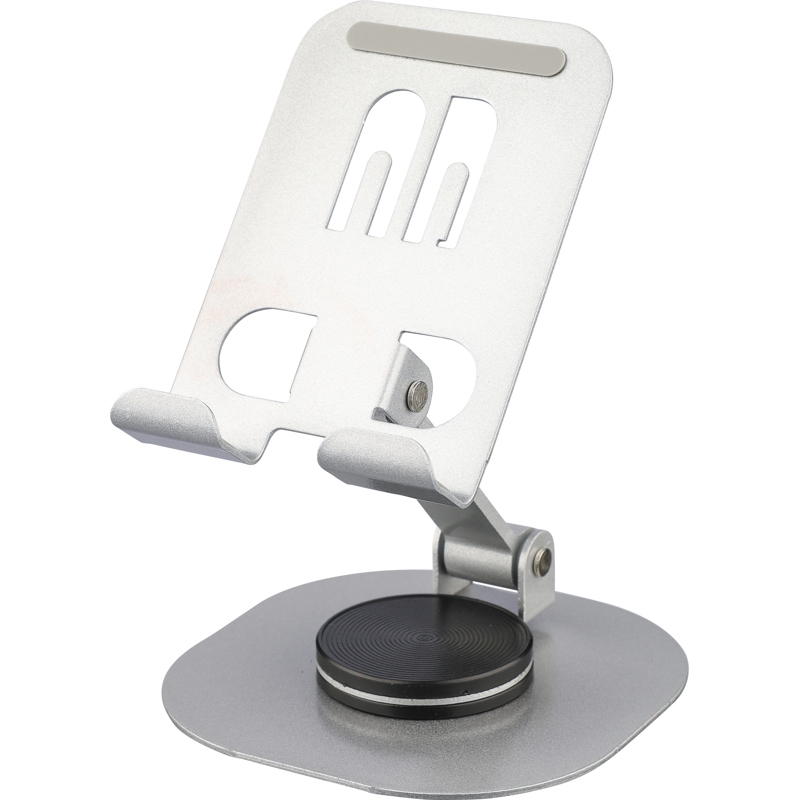 Phone stand with 360-degree rotation function. Can be fully folded flat for easy storage. Sturdy and weighty design for stable support. Individually packaged in a white box.