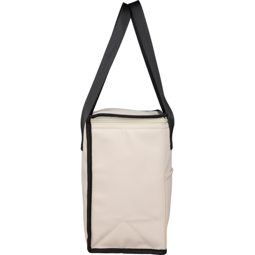 Recycled PU cooler bag with a 9 litre capacity. Features long carrying handles and a front pocket for additional storage and a small label with recycled logo.