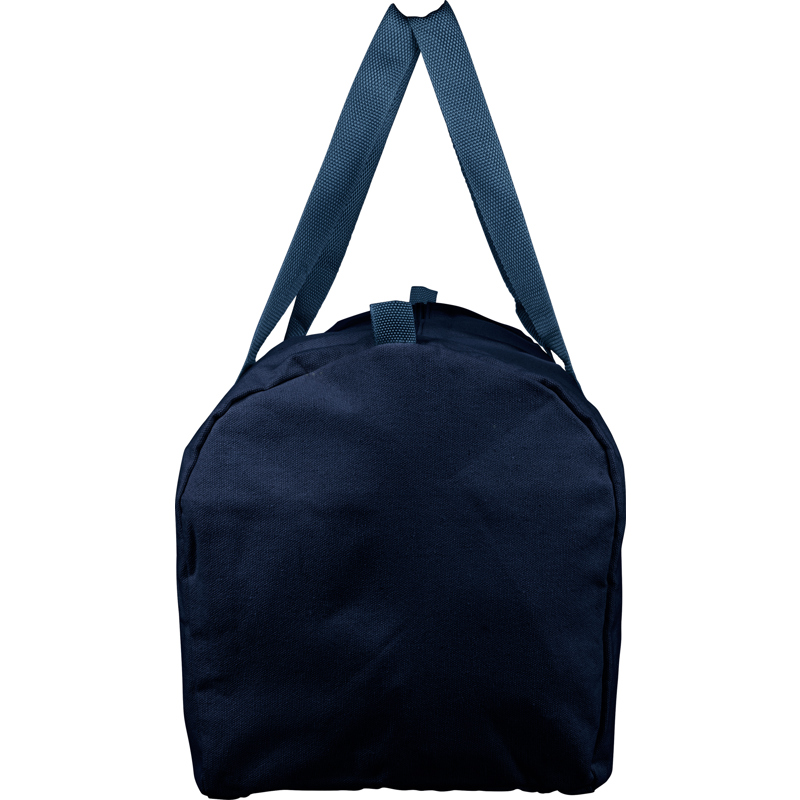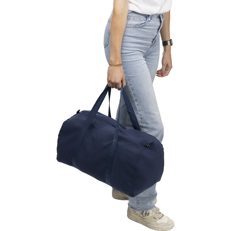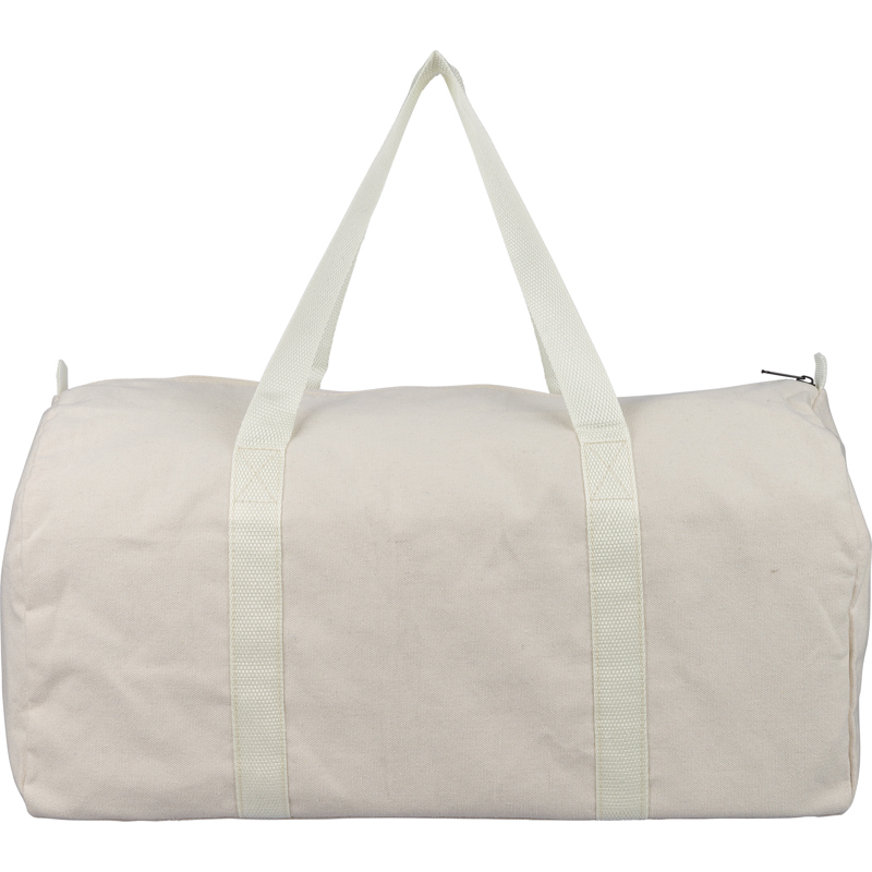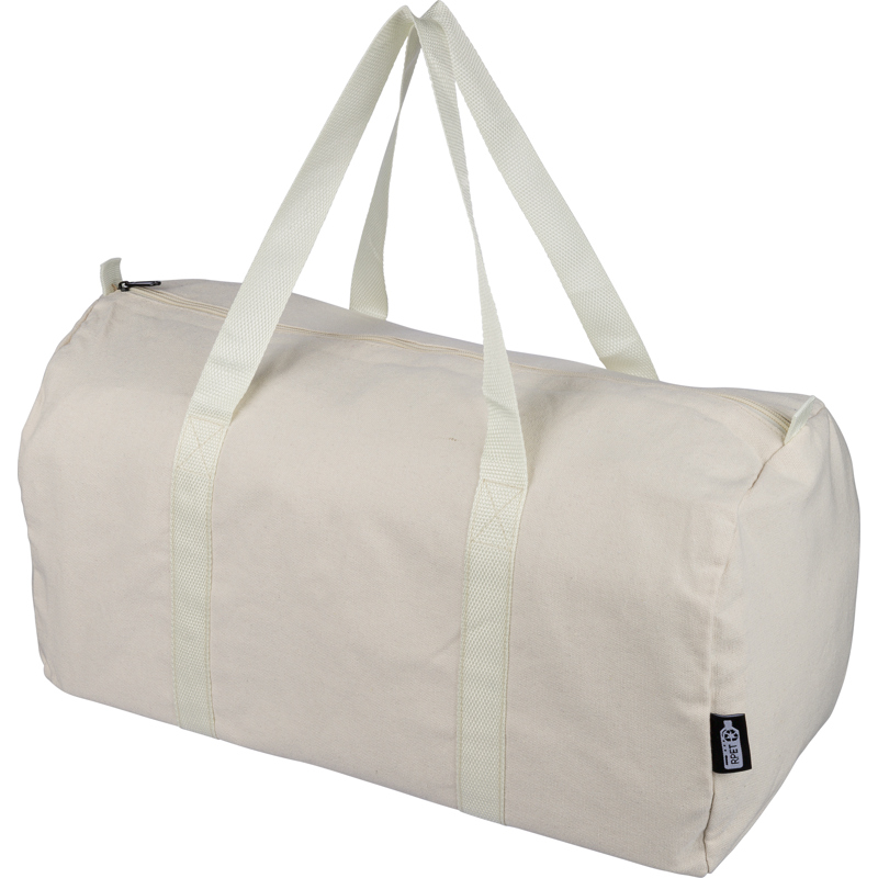 Recycled polycotton (330 gsm) travel bag with a large zipped main compartment and carry handles.
