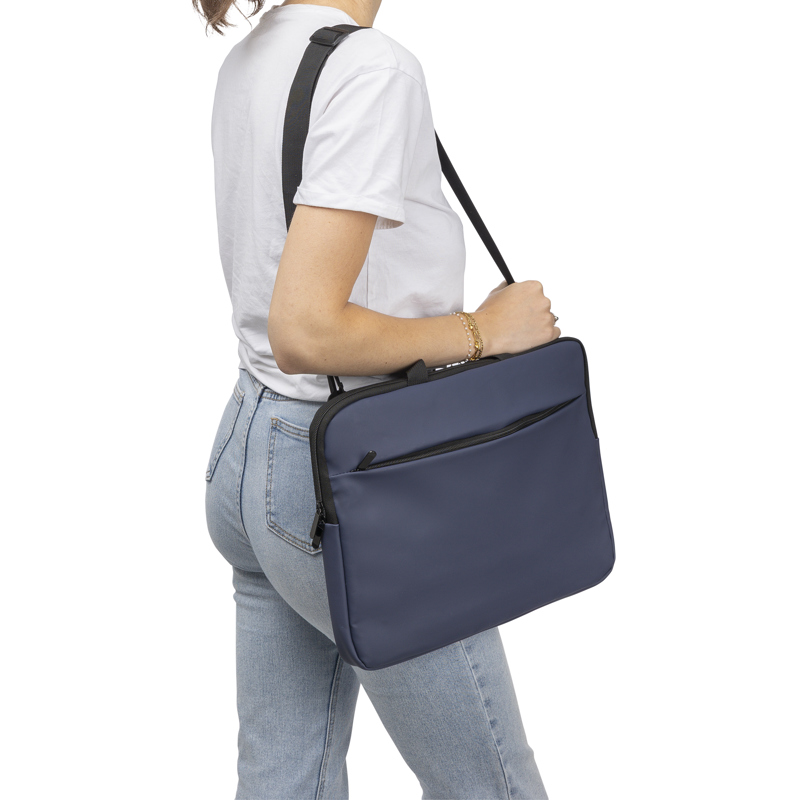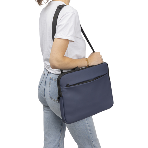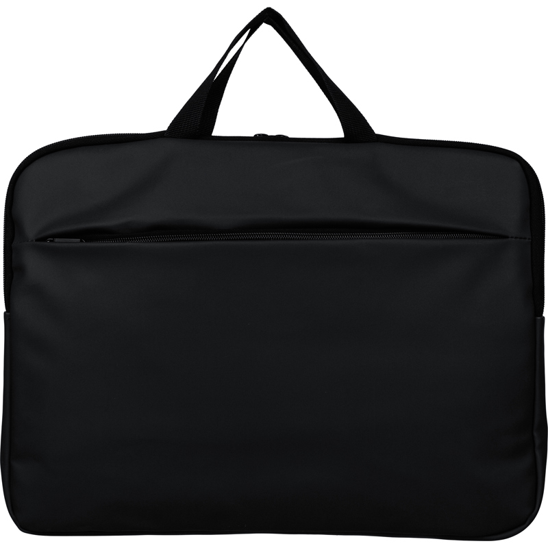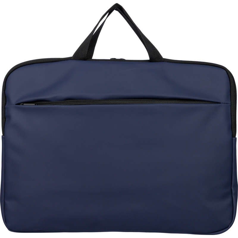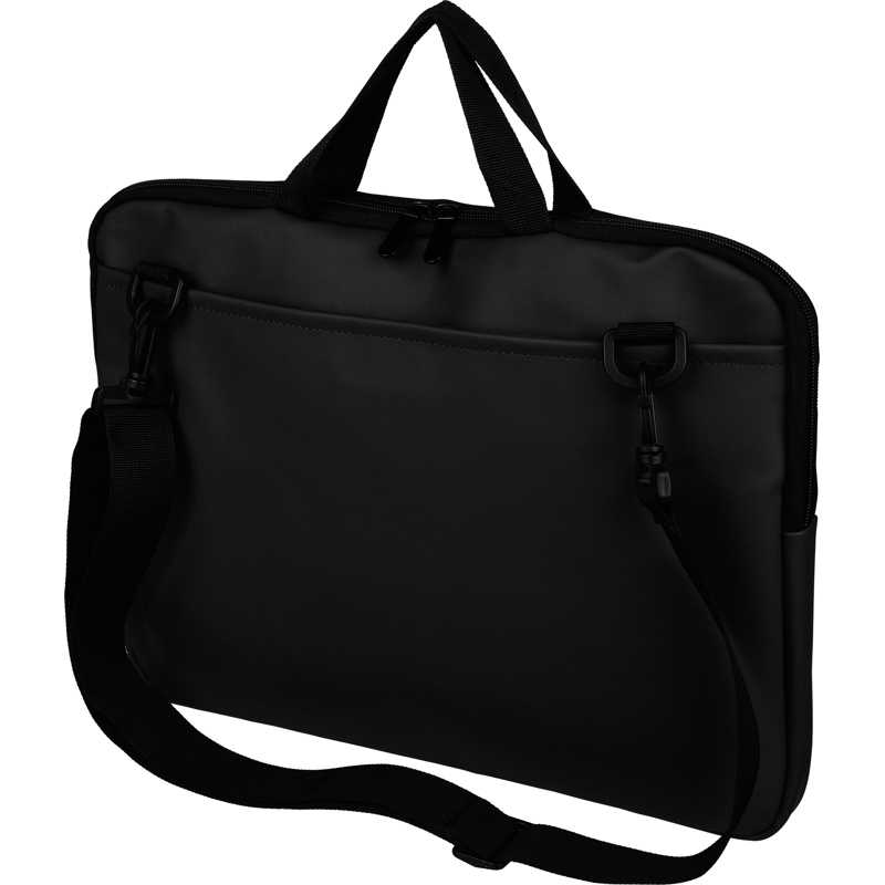 Recycled PU laptop bag for devices up to 15? with 4mm padding and 210D recycled lining. Features a front zipped pocket, back pocket with velcro, two short carry handles and adjustable shoulder strap.