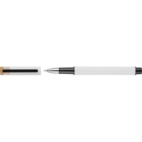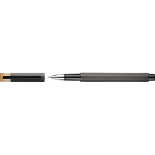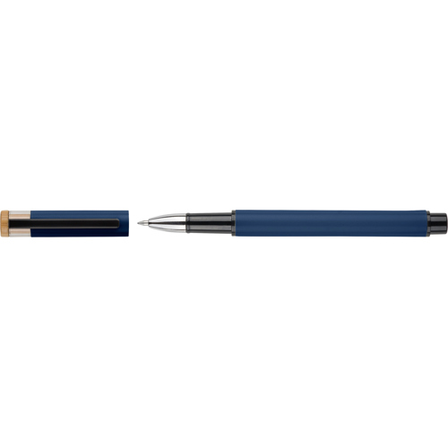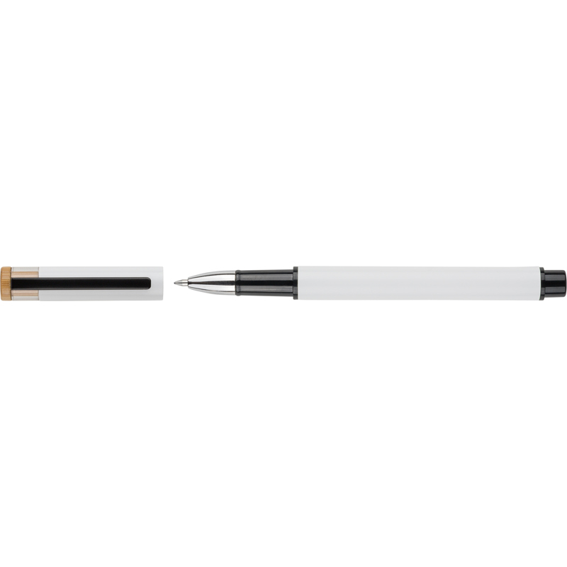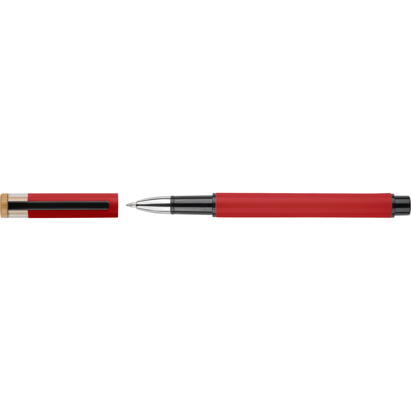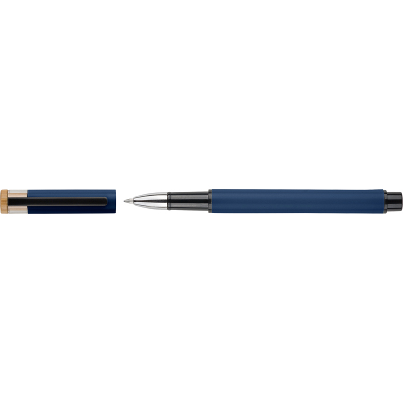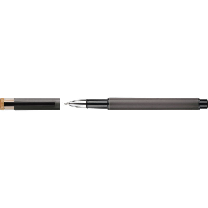 Recycled aluminium lacquered pen set with ballpen and rollerpen with blue ink. Both with engraved a recycled logo. Blue ink. Packed in a recycled cardboard gift box.