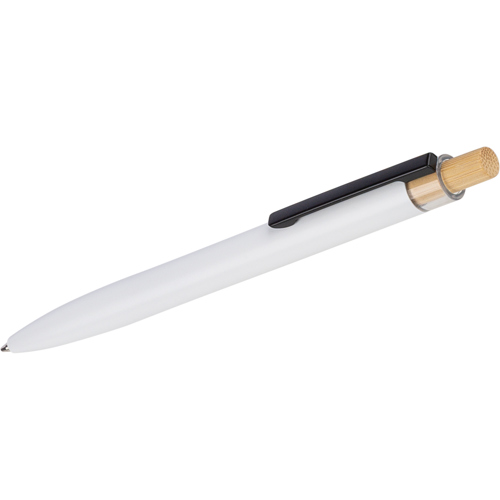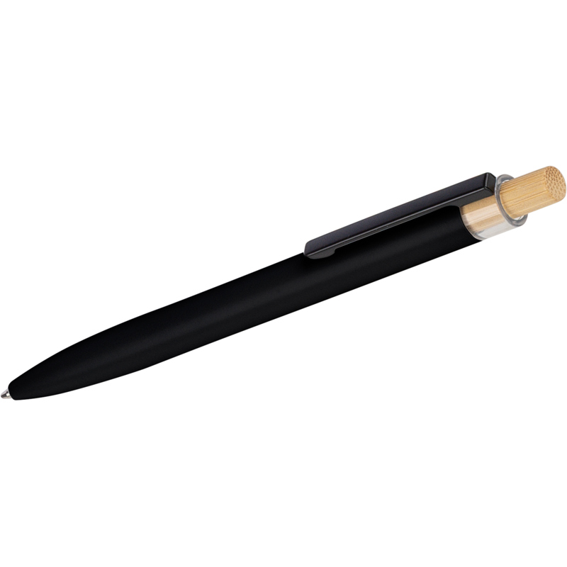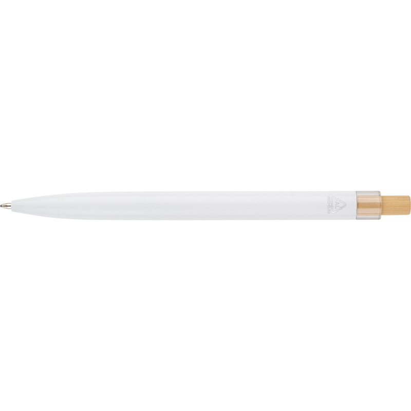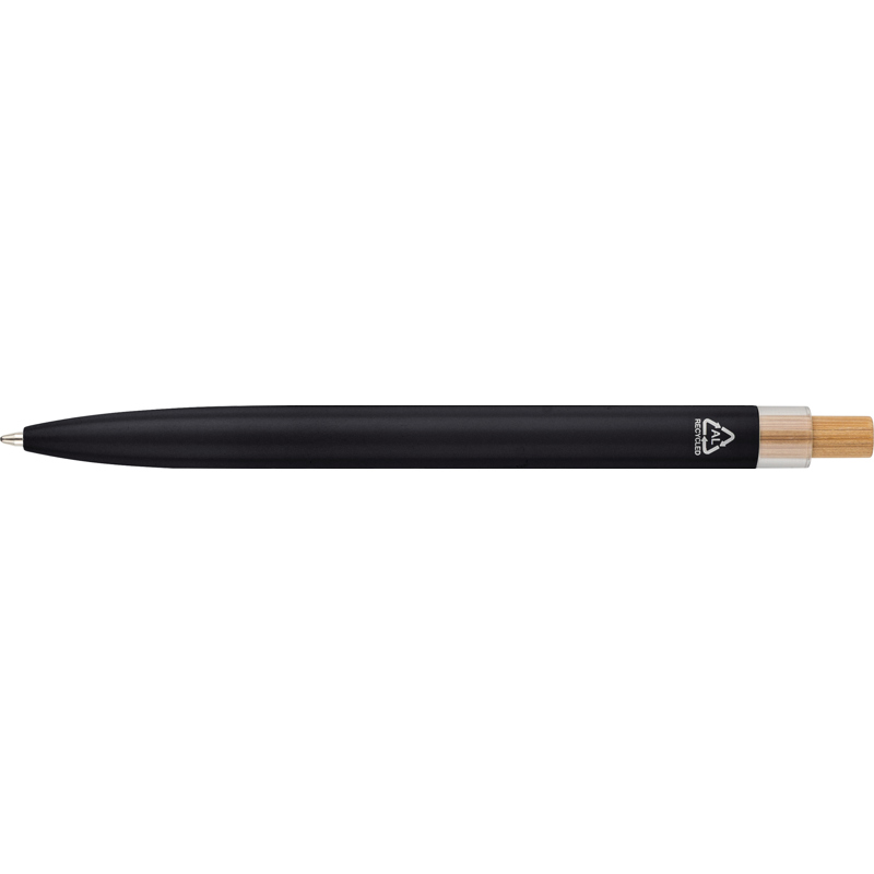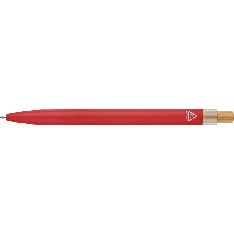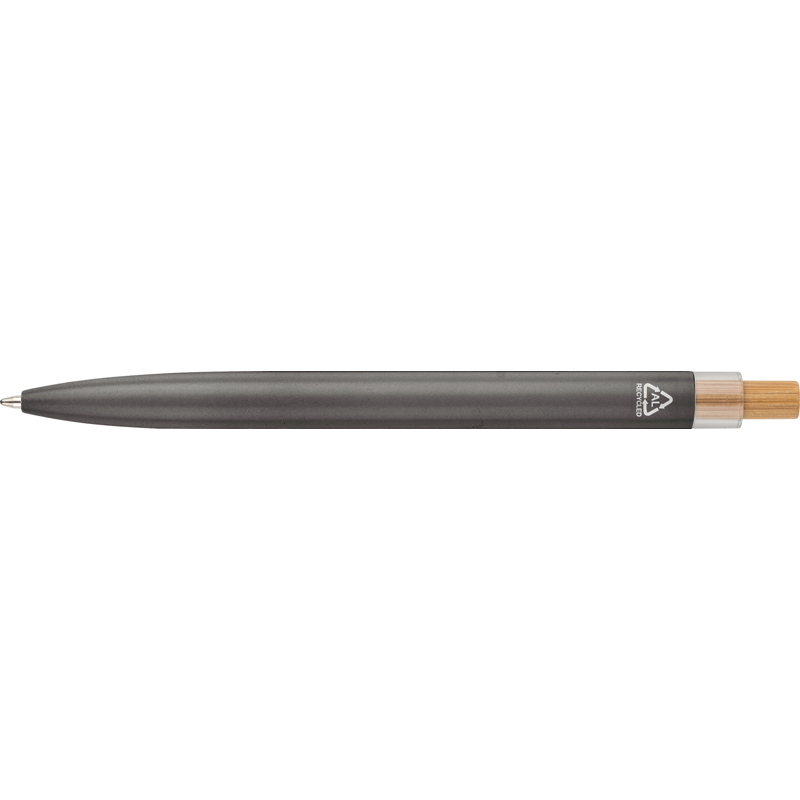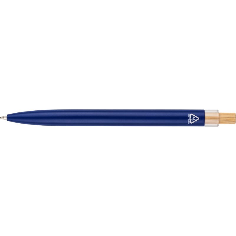 Recycled aluminium lacquered with bamboo push button with metal clip and blue ink. Features an engraved recycled logo.