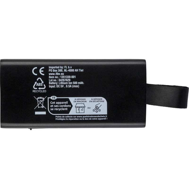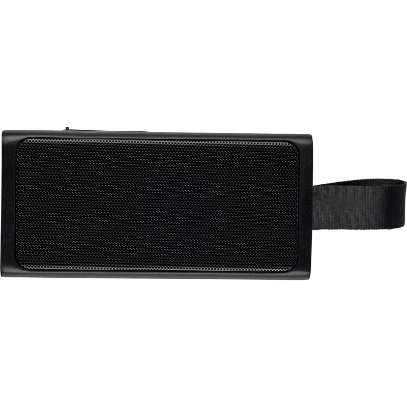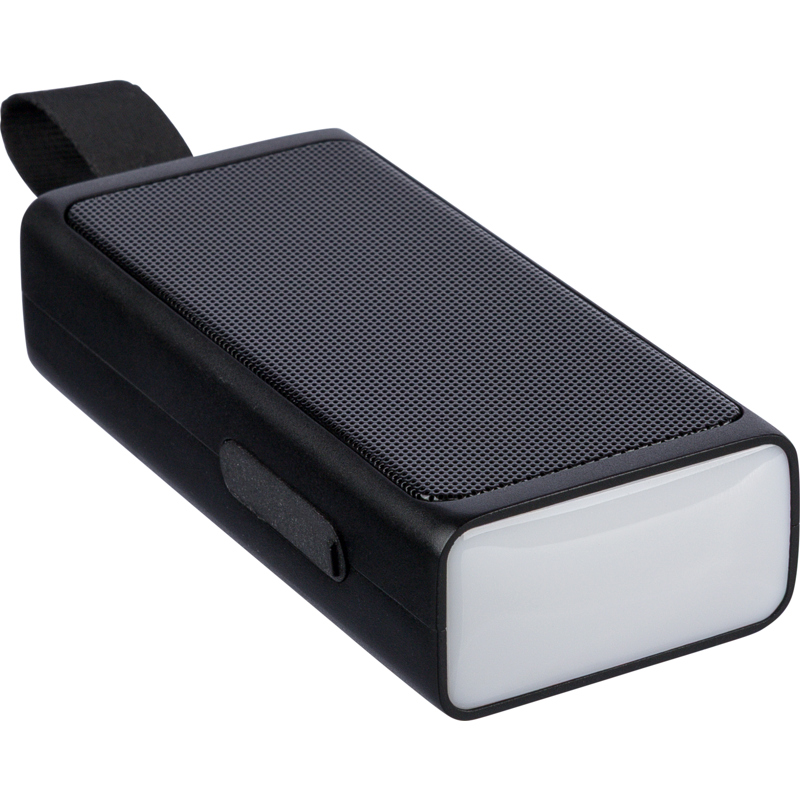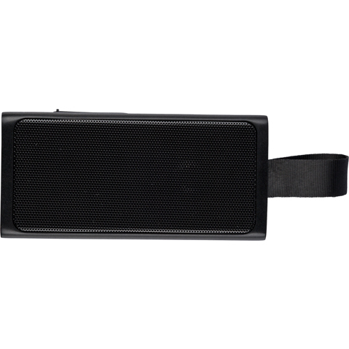 Recycled 5W speaker with a COB LED flashlight, silicone carry loop and wireless tech 5.4. 500 mAh battery, 5V/500 mA input. Outdoor design with recycled logo. Packed in brown box.