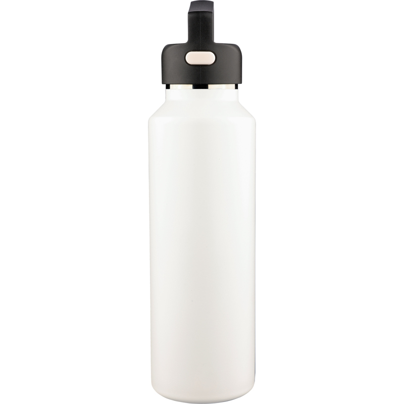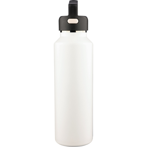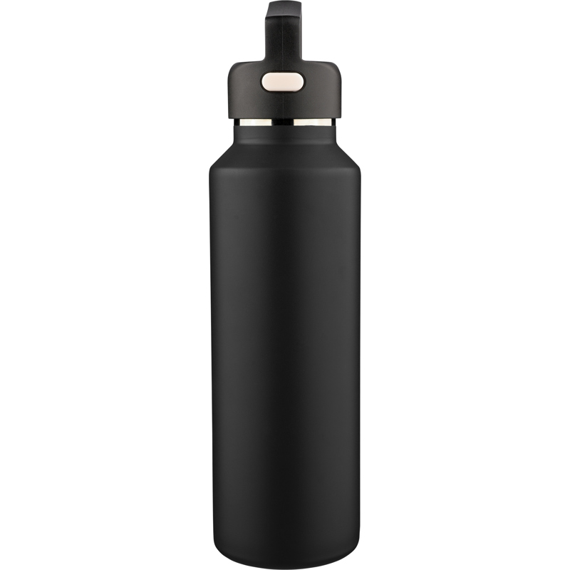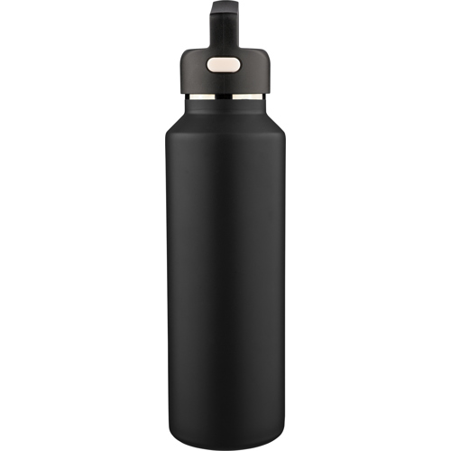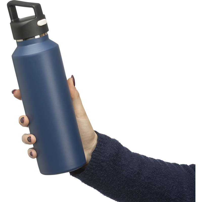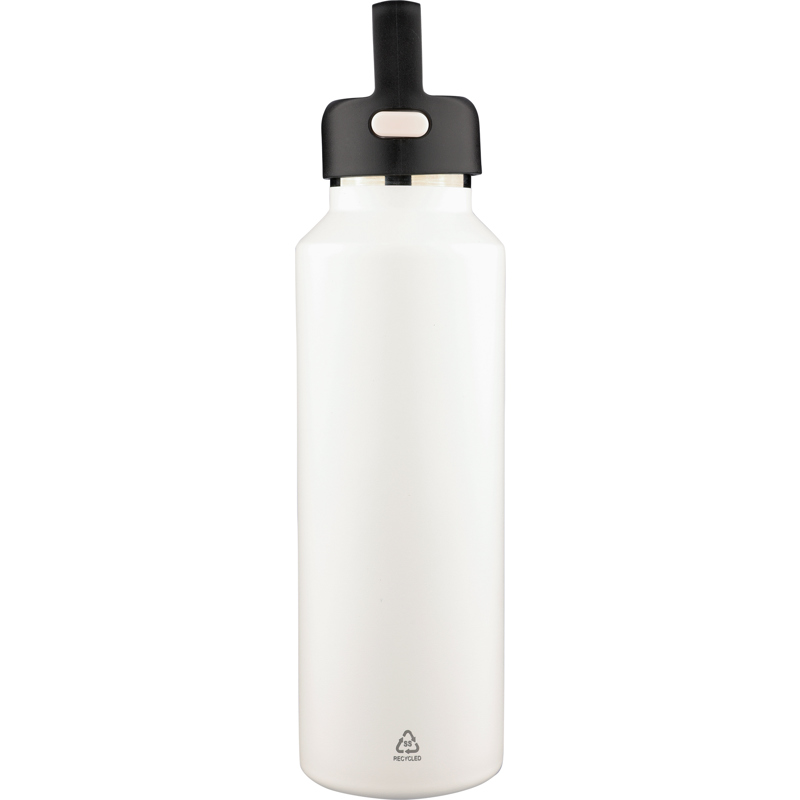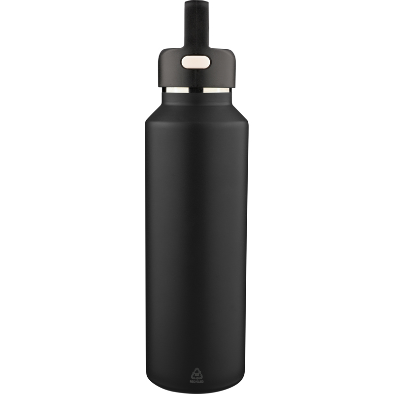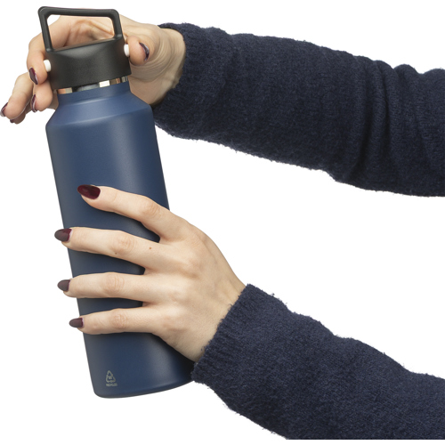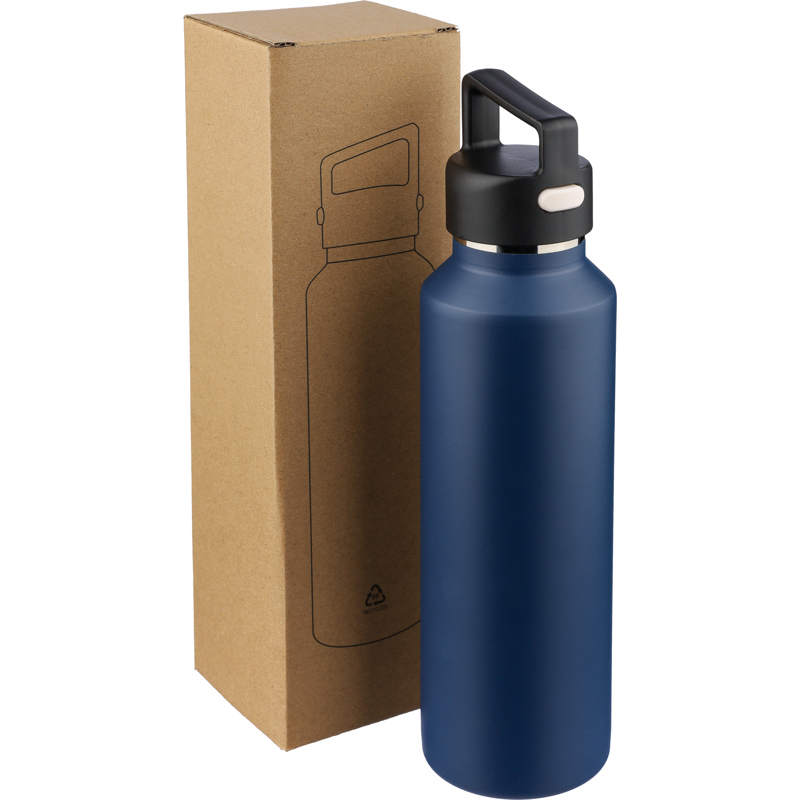 Recycled stainless steel vacuum bottle (600 ml) with double-wall construction, lid with carry loop and dual push-button opening, Packed in a brown box.