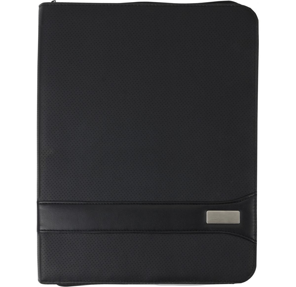 Custom printed A4 Zipped PVC folder with two large internal pockets and four small credit card size pockets, pen loop and thirty page lined note pad.