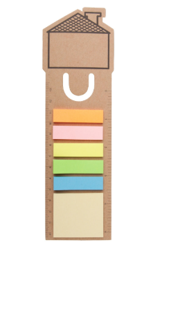 House shaped bookmark made from card with five different coloured sticky page memos, a 15 sheet sticky note pad, and a ruler.