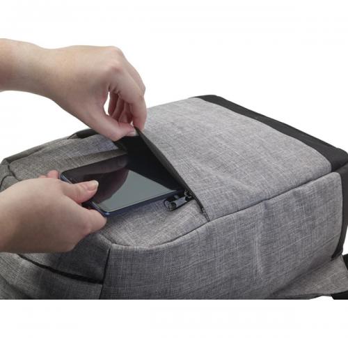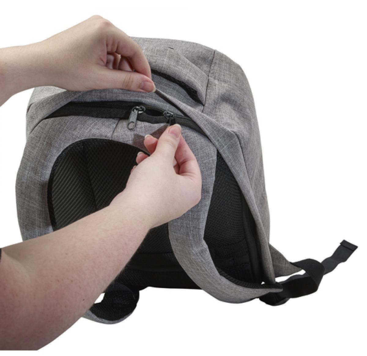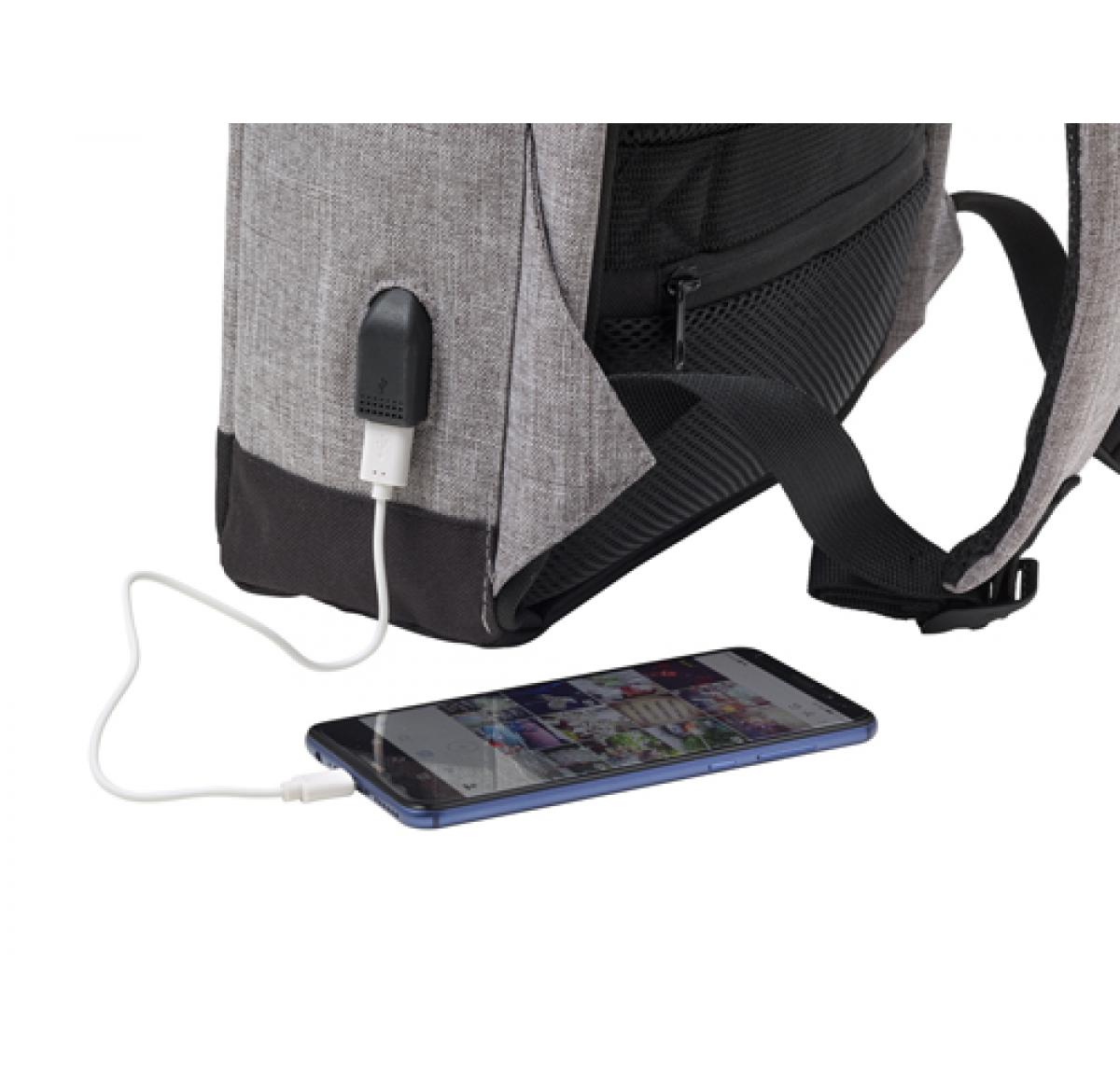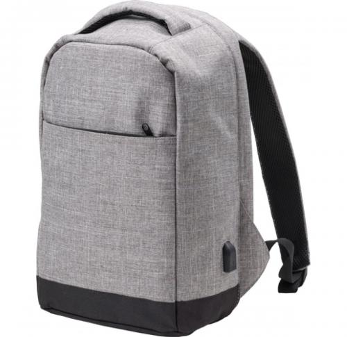 Two-tone polyester (600D) anti-theft backpack , with PVC backing. The backpack has a laptop compartment, multiple interior pockets including a one with zipper, an outer pocket with zipper and a USB port at the side with a cable on the inside.