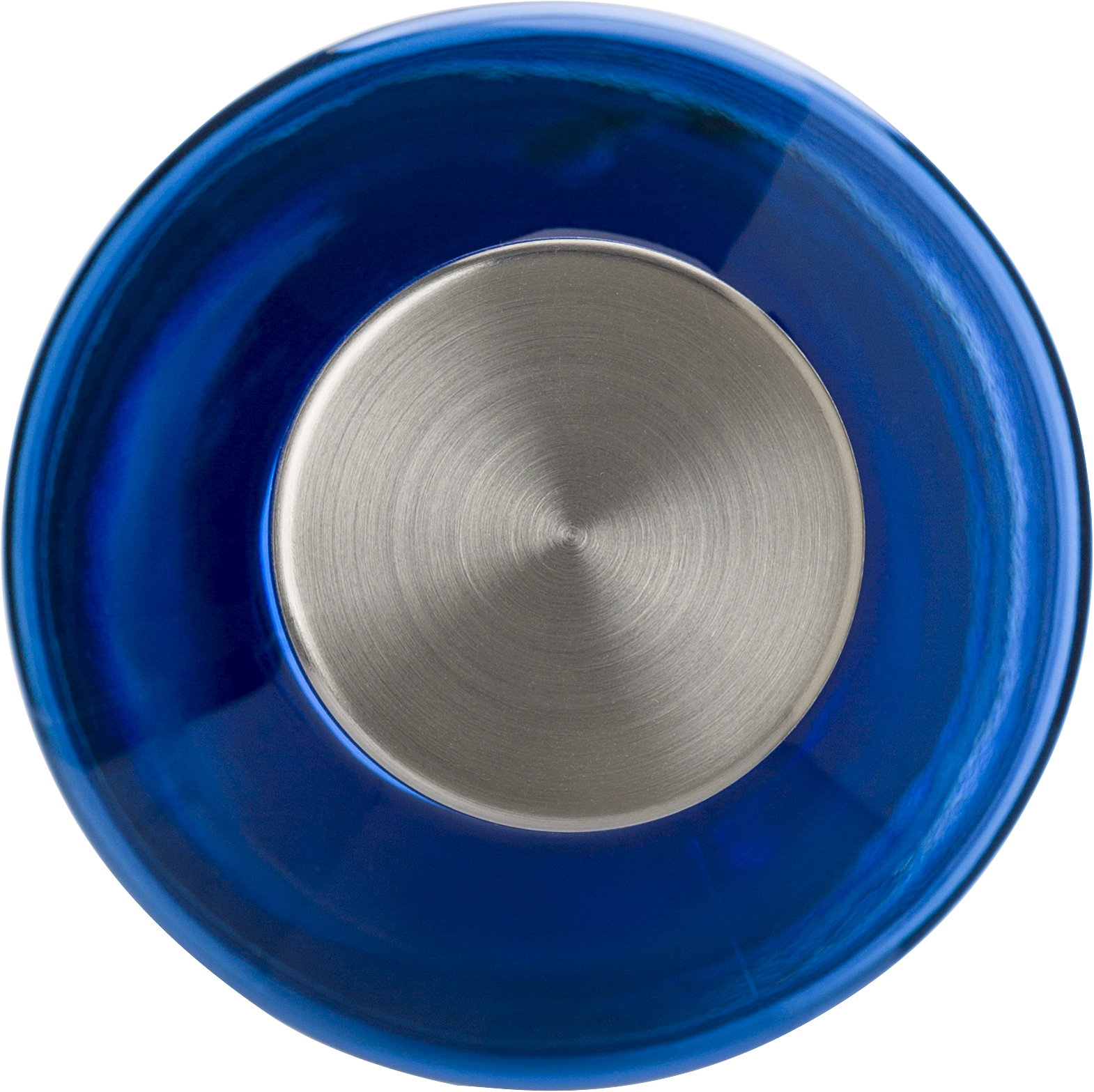 Transparent Tritan water bottle (850 ml) with metal bottom and metal on the top of the screw cap. The rubber ring around the screwcap matches the colour of the bottle.