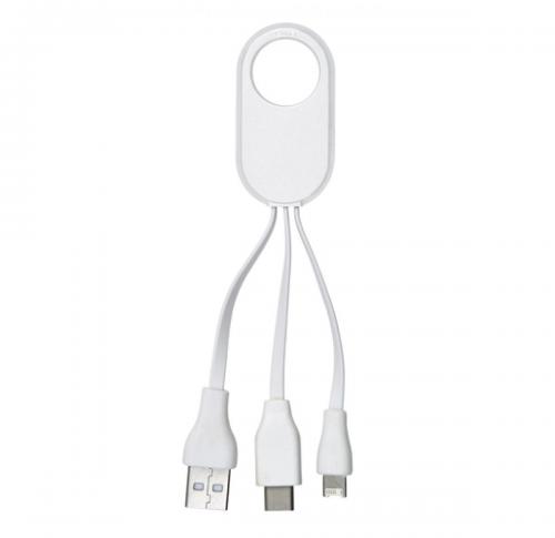 Charger cable set with three plugs: USB-C connector with two connectors: Lightning and standard USB. Each cable is approximately 5,5 cm long and attaches to an oval holder with opening (Ø 1,8 cm).