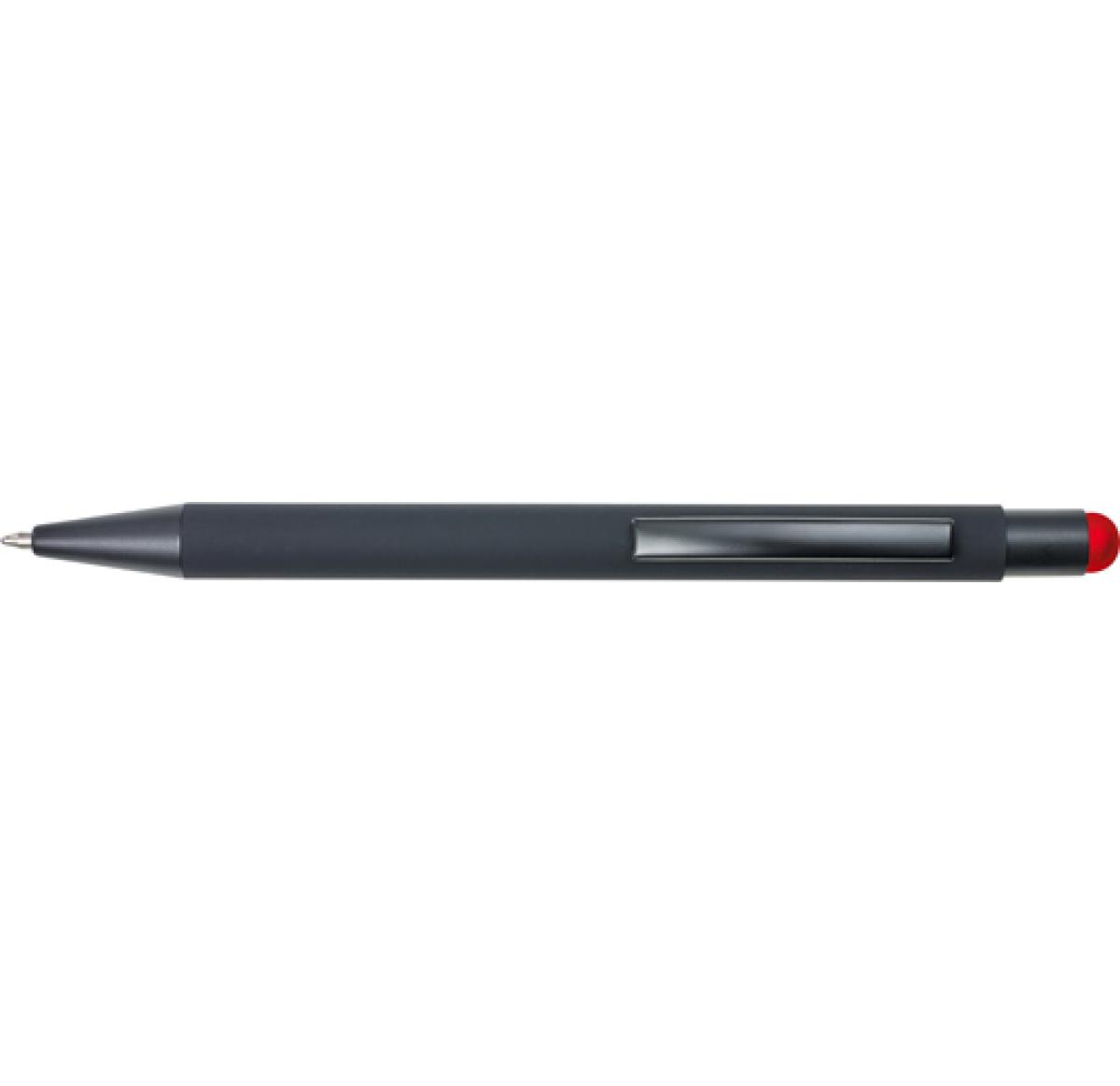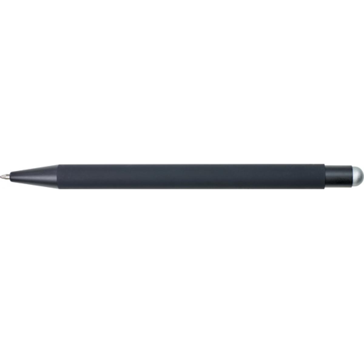 Rubberized black ballpen with blue ink and rubber tip to operate capacitive screens. The inside of the barrel and the rubber tip are coloured. When the item is lasered, the imprint will show in colour.
