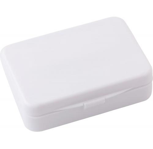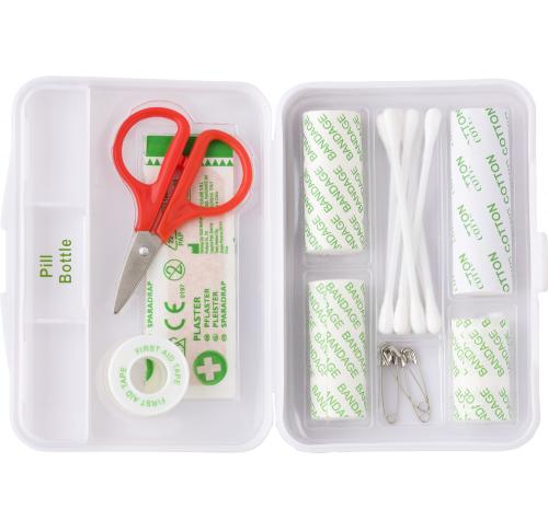 Plastic case with first aid kit. Includes: tape, scissors, 5 adhesive plasters, bandages (3.3x100cm, 4.5x100cm and 4.5x150cm), hemostatic cotton, 8 cotton swabs, and 4 pins