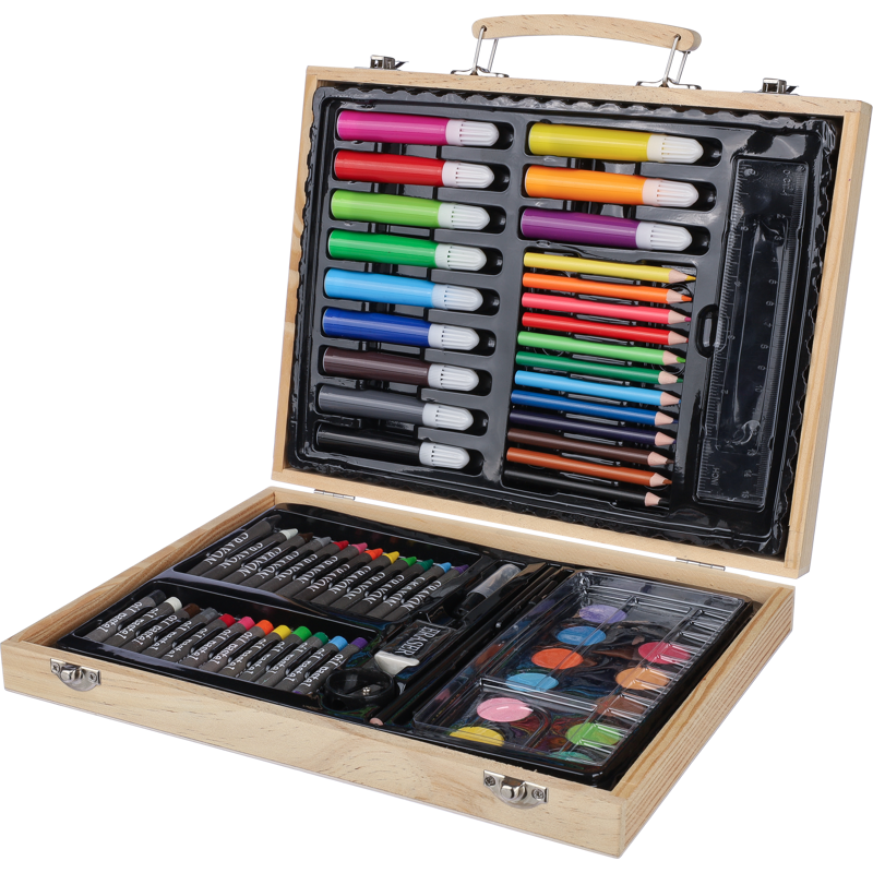 Art drawing set in a wooden pine case. Contains 12 wax crayons, 12 sharpened coloured pencils, 12 felt-tip pens, 12 oil crayons, a glue stick, eraser, pencil sharpener, ruler, brush, 12 paints and a palette. Packed individually in a brown carton box, leaving the handle accessible for carrying.