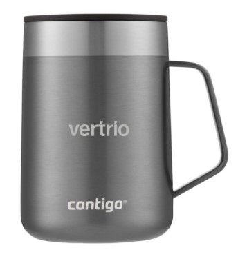 Double-walled, vacuum-insulated stainless steel thermo cup made by Contigo®. With splash-proof one-piece lid to prevent spills. THERMALOCK™ technology keeps drinks cold up to 15 hours and hot up to 5 hours. With sleek stainless steel handle. Suitable for almost all coffee machines. Food Approved. Easy clean. Lid and body are top-rack dishwasher-safe.
