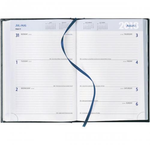 A5 Week to View desk diaries with a 4-colour process cover - flat to board. Gloss or Matt laminate. White paper. Ribbon marker. Perforated page corners. Packed in bulk.