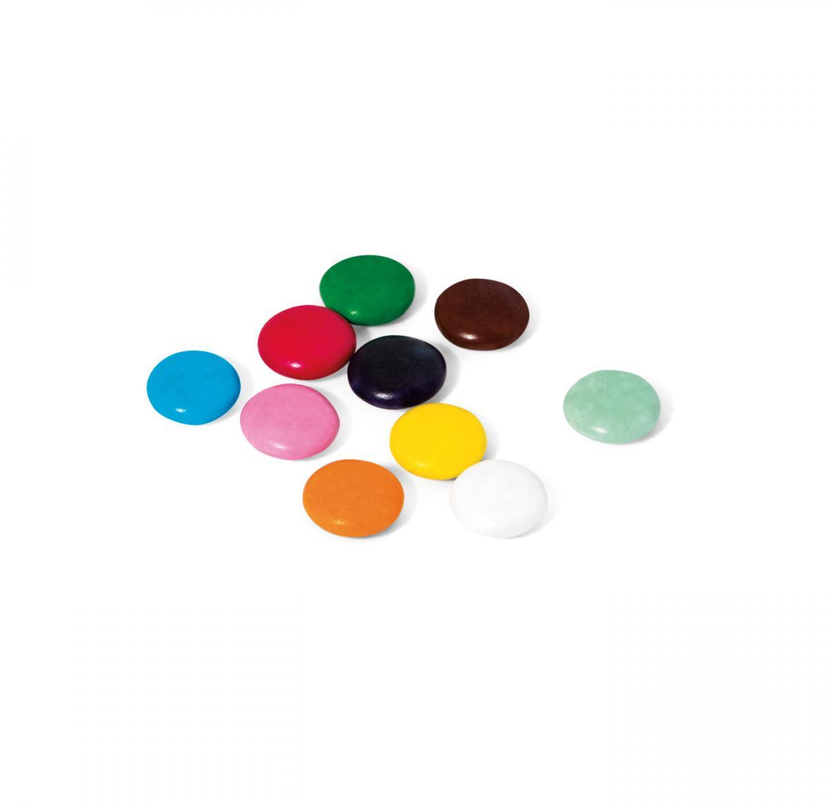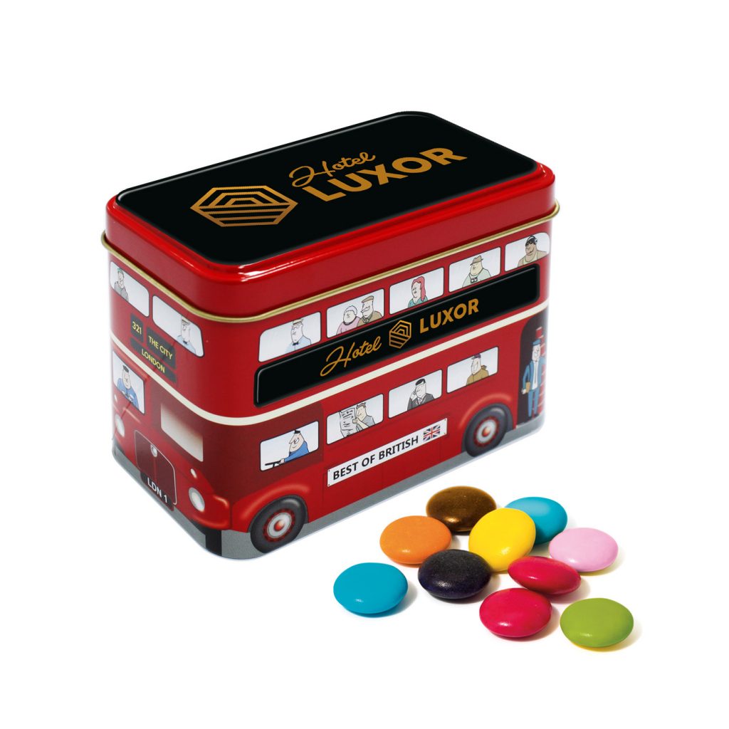 A Bus Tin filled with sugar coated chocolate beanies. Branded with full colour domes to the lid and both sides of the tin.