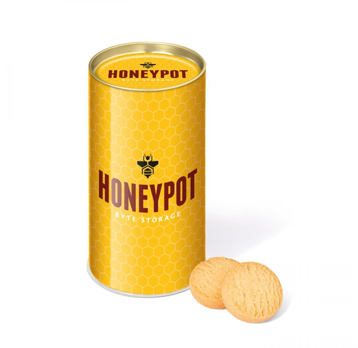 A large Snack Tube filled with mini buttered shortbread biscuits. Branded with a full colour domed label to the lid, and cast-gloss board wrap to the tube.