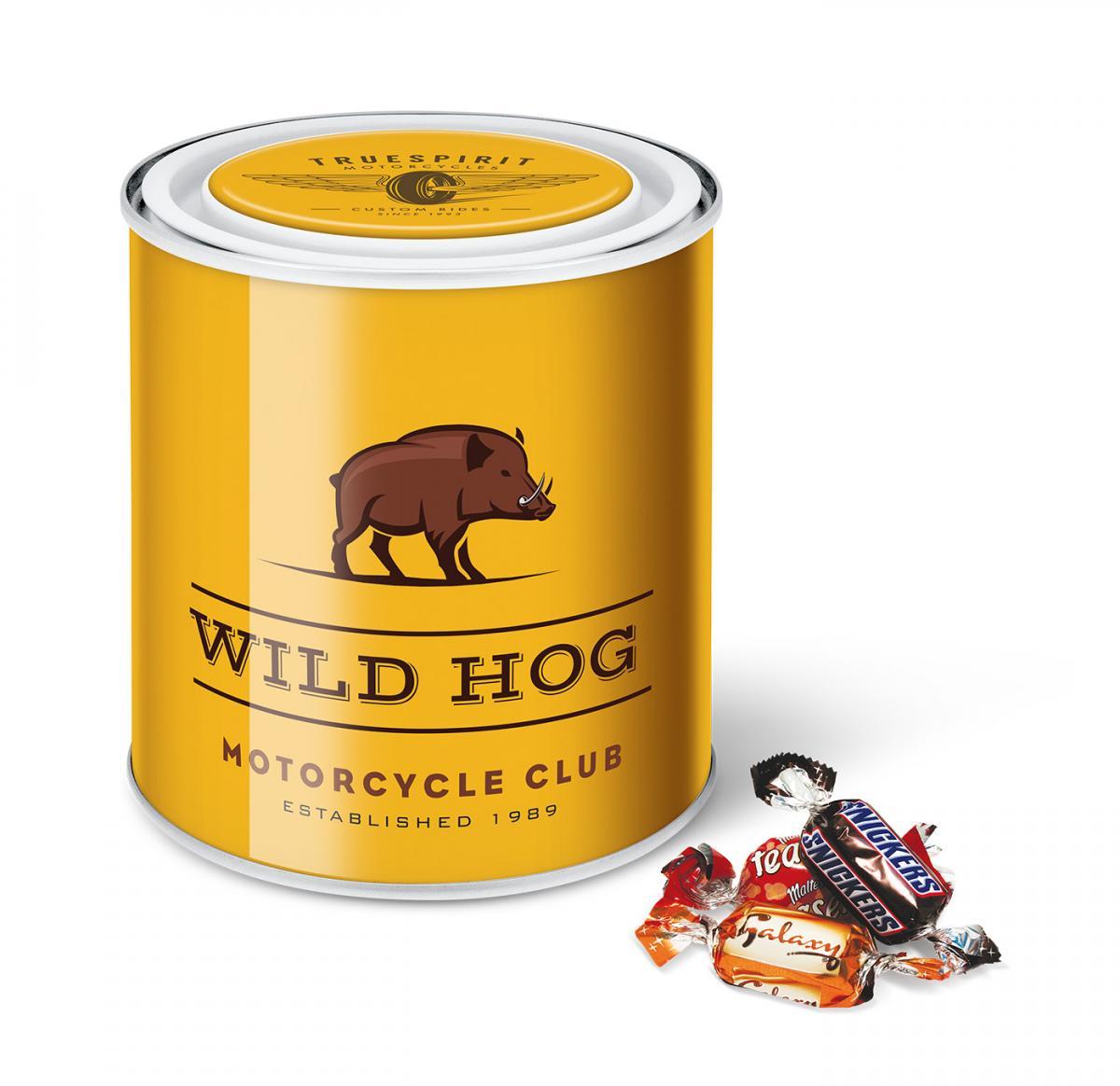 A large Paint Tin filled with a selection of Celebration chocolates. Branded with a full colour domed label and cast-gloss wrap.