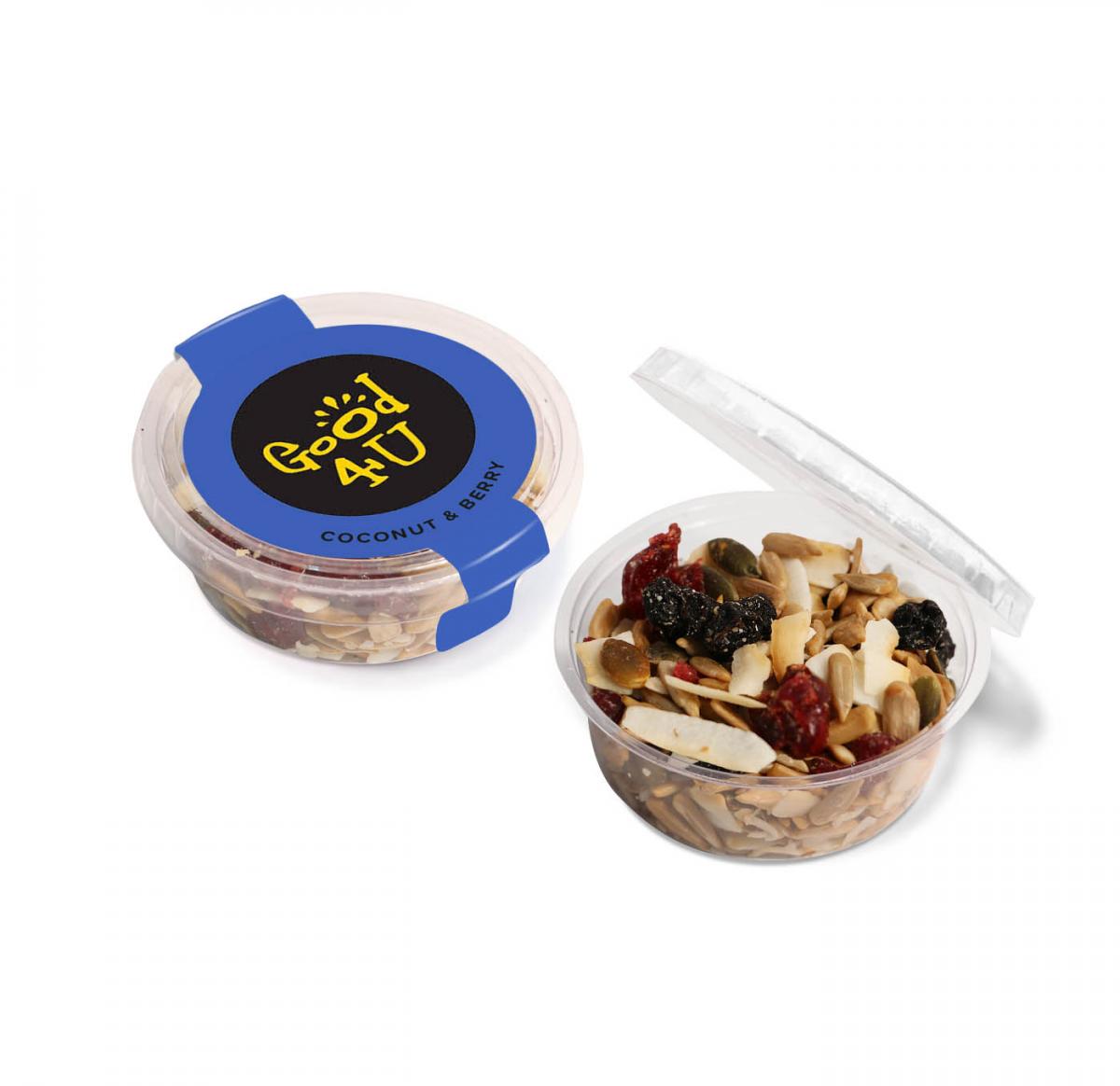 A midi eco pot filled with Good 4 U's Coconut & Berry snacks. Branded with a full colour semi gloss wrap to the pot.