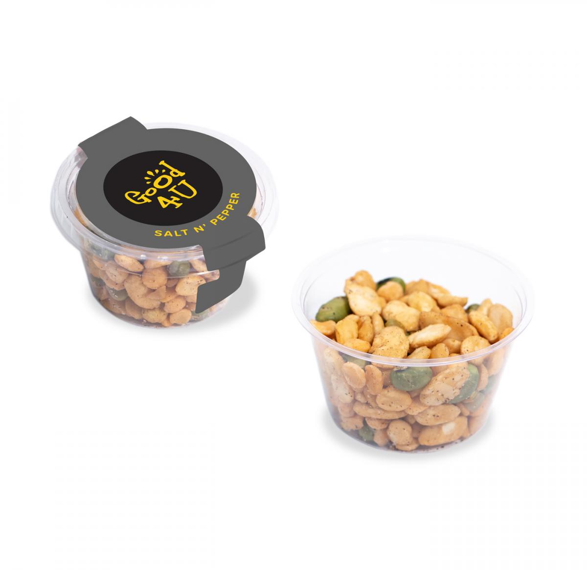 A maxi eco pot filled with Good 4 U’s Salt & Pepper Snack. Branded with a full colour semi gloss wrap to the pot.