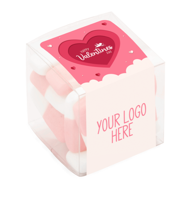 This eco-friendly Recyclable Plastic Clear Cube is filled with Valentine’s Raspberry & Milk Flavour Gums.