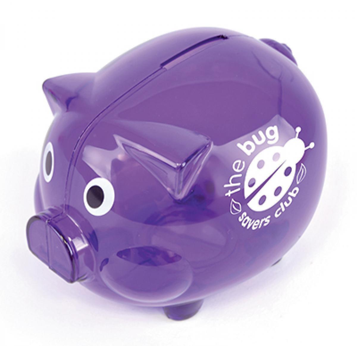 Plastic piggy bank with great branding area. Keep piling in the pennies and watch the piggy bank fill up. To empty simply untwist the base cap. EN71 approved.