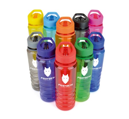 750ml single walled translucent coloured PET plastic drinks bottle with PP plastic coloured lid, PE plastic straw, coloured band and AS plastic coloured sip mouth piece. BPA & PVC free. Available in 10 colours.