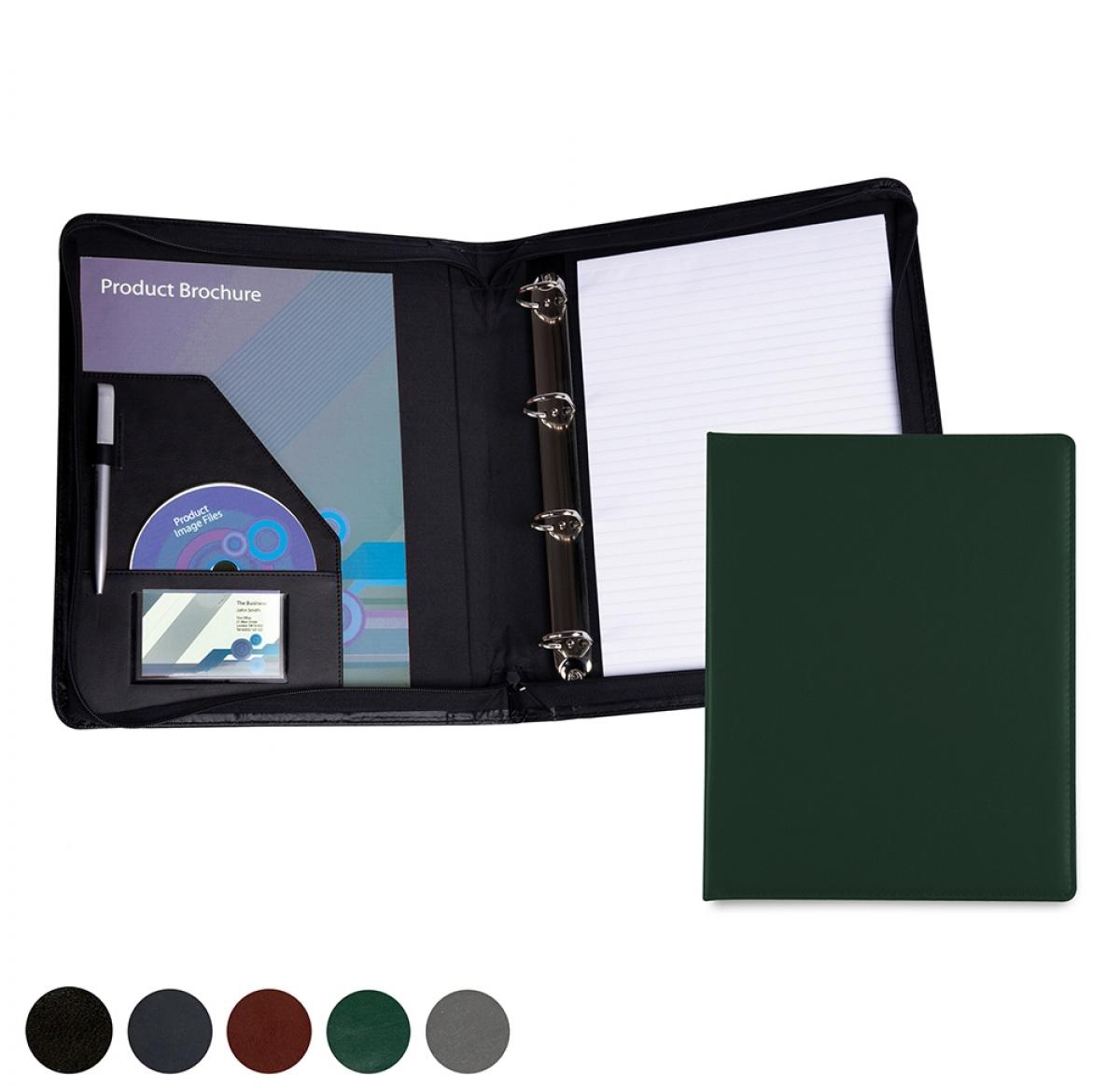 Hampton Leather Zipped Ring Binder with a lightly padded and stitched cover, finished in Hampton finecell leather which has a natural grain and an excellent emboss quality in a choice of 5 colours. Product features include Padded & Stitched Cover, Black Interior, Angled pocket for notes, Business card pocket, 25mm 2 or 4 Ring "D" Mechanism, Pen loop, Fitted lined pad.